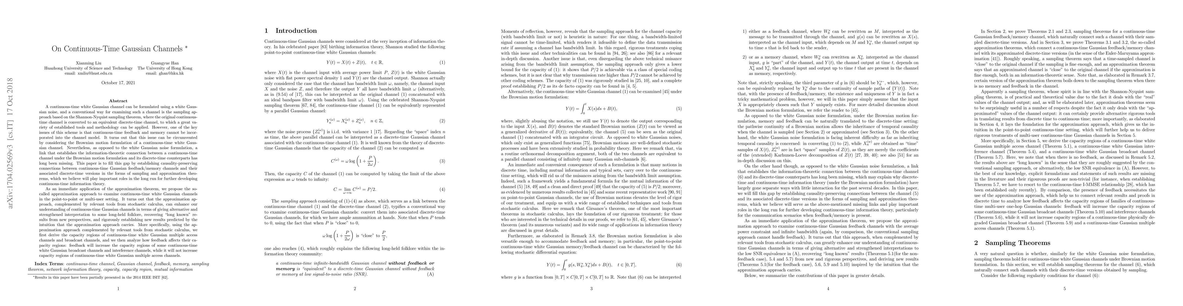 A continuous-time white Gaussian channel can be formulated using a white Gaussian noise, and a conventional way for examining such a channel is the sampling approach based on the Shannon-Nyquist sampling theorem, where the original continuous-time channel is converted to an equivalent discrete-time channel, to which a great variety of established tools and methodology can be applied. However, one of the key issues of this scheme is that continuous-time feedback and memory cannot be incorporated into the channel model. It turns out that this issue can be circumvented by considering the Brownian motion formulation of a continuous-time white Gaussian channel. Nevertheless, as opposed to the white Gaussian noise formulation, a link that establishes the information-theoretic connection between a continuous-time channel under the Brownian motion formulation and its discrete-time counterparts has long been missing. This paper is to fill this gap by establishing causality-preserving connections between continuous-time Gaussian feedback/memory channels and their associated discrete-time versions in the forms of sampling and approximation theorems, which we believe will play important roles in the long run for further developing continuous-time information theory. As an immediate application of the approximation theorem, we propose the so-called approximation approach to examine continuous-time white Gaussian channels in the point-to-point or multi-user setting. It turns out that the approximation approach, complemented by relevant tools from stochastic calculus, can enhance our understanding of continuous-time Gaussian channels in terms of giving alternative and strengthened interpretation to some long-held folklore, recovering "long known" results from new perspectives, and rigorously establishing new results predicted by the intuition that the approximation approach carries.