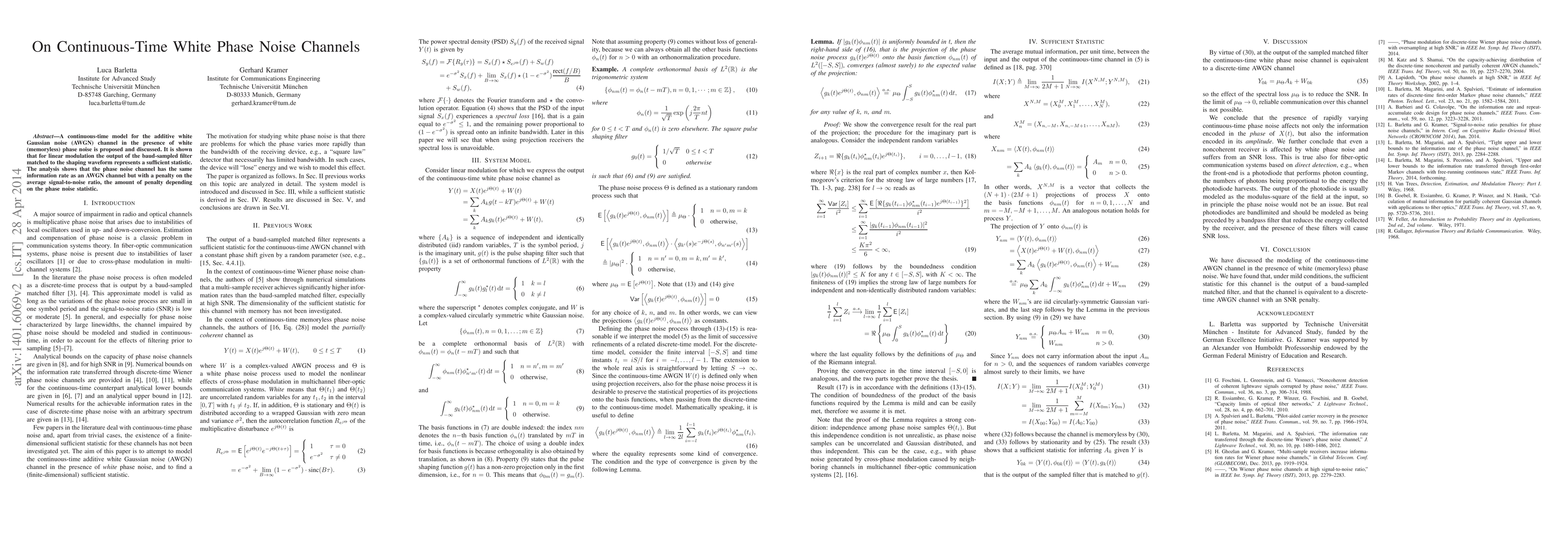 A continuous-time model for the additive white Gaussian noise (AWGN) channel in the presence of white (memoryless) phase noise is proposed and discussed. It is shown that for linear modulation the output of the baud-sampled filter matched to the shaping waveform represents a sufficient statistic. The analysis shows that the phase noise channel has the same information rate as an AWGN channel but with a penalty on the average signal-to-noise ratio, the amount of penalty depending on the phase noise statistic.