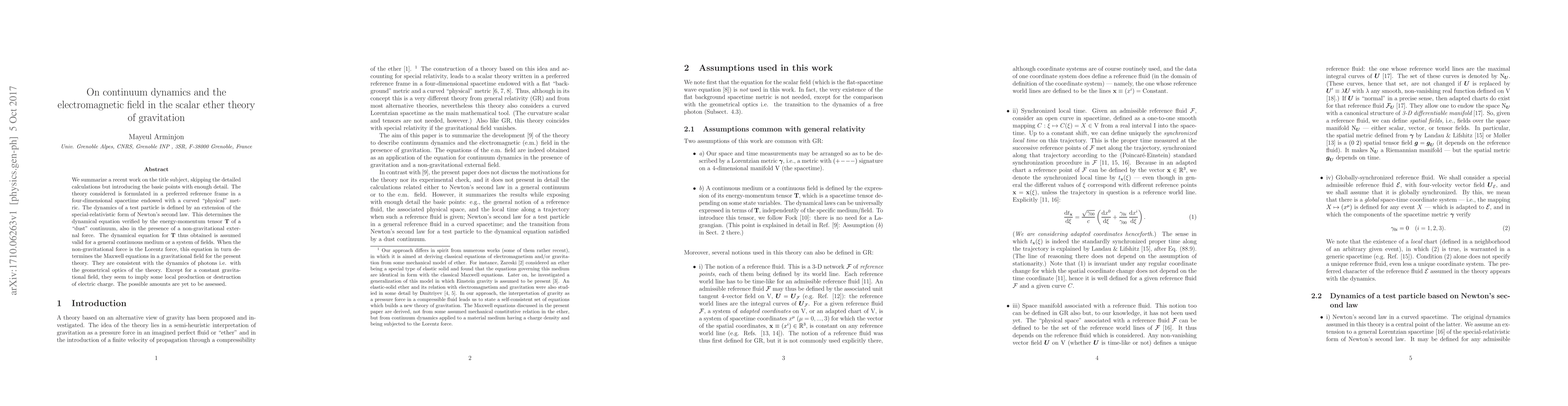 We summarize a recent work on the title subject, skipping the detailed calculations but introducing the basic points with enough detail. The theory considered is formulated in a preferred reference frame in a four-dimensional spacetime endowed with a curved "physical" metric. The dynamics of a test particle is defined by an extension of the special-relativistic form of Newton's second law. This determines the dynamical equation verified by the energy-momentum tensor ${\bf T}$ of a "dust" continuum, also in the presence of a non-gravitational external force. The dynamical equation for ${\bf T}$ thus obtained is assumed valid for a general continuous medium or a system of fields. When the non-gravitational force is the Lorentz force, this equation in turn determines the Maxwell equations in a gravitational field for the present theory. They are consistent with the dynamics of photons i.e. with the geometrical optics of the theory. Except for a constant gravitational field, they seem to imply some local production or destruction of electric charge. The possible amounts are yet to be assessed.