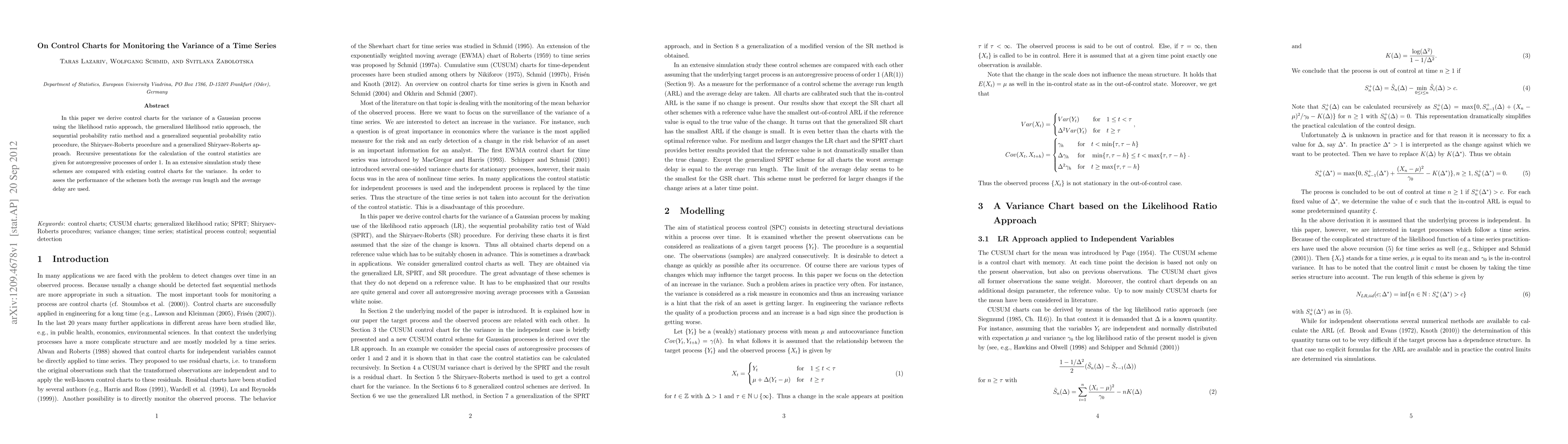In this paper we derive control charts for the variance of a Gaussian process using the likelihood ratio approach, the generalized likelihood ratio approach, the sequential probability ratio method and a generalized sequential probability ratio procedure, the Shiryaev-Roberts procedure and a generalized Shiryaev-Roberts ap- proach. Recursive presentations for the calculation of the control statistics are given for autoregressive processes of order 1. In an extensive simulation study these schemes are compared with existing control charts for the variance. In order to asses the performance of the schemes both the average run length and the average delay are used.