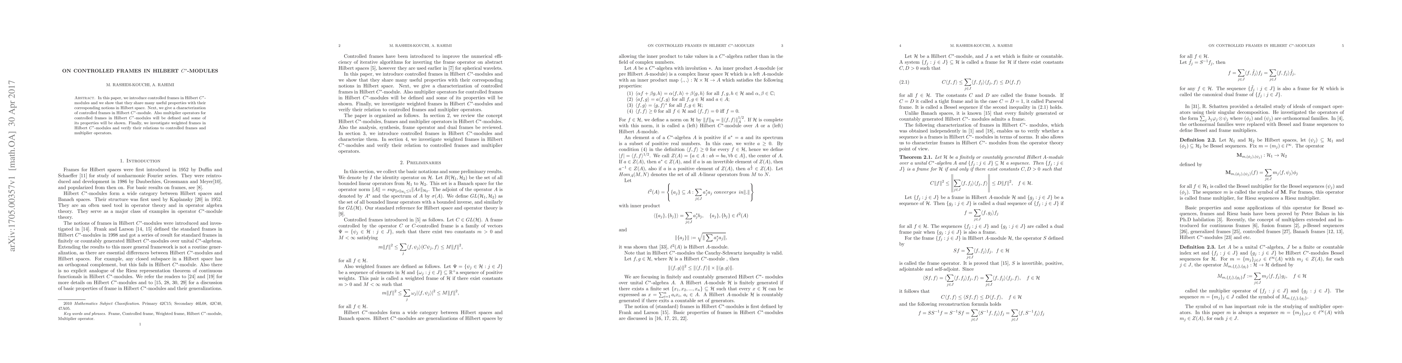 This paper introduces controlled frames in Hilbert $C^*$-modules, demonstrating their properties akin to those in Hilbert spaces, and provides a characterization of these frames. It also defines multiplier operators for these frames and explores their properties, alongside investigating weighted frames and their connections to controlled frames and multiplier operators.