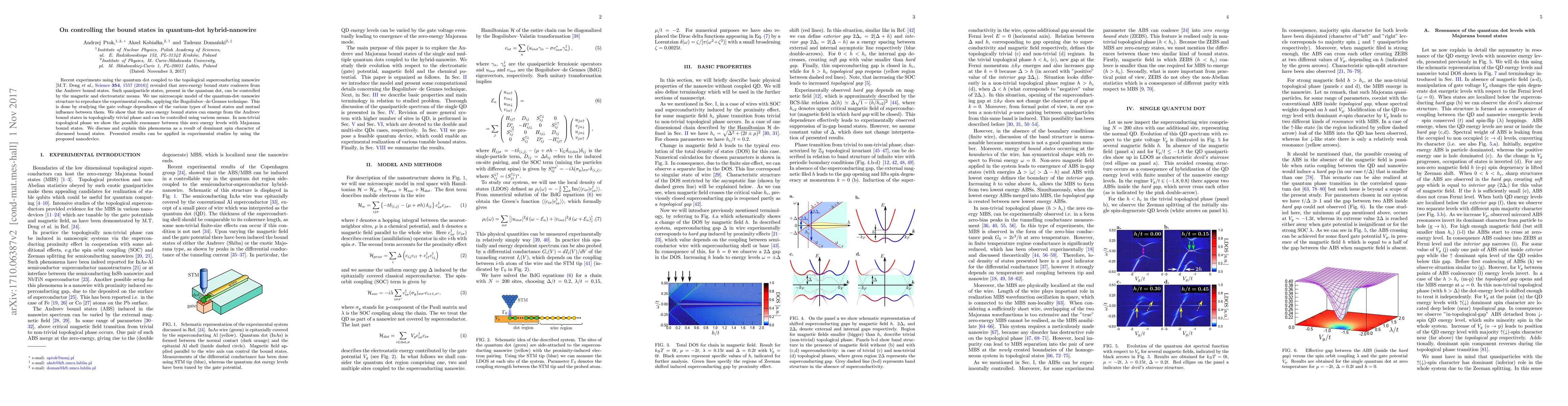 This paper investigates the control of zero-energy bound states in quantum dot-nanowire hybrid systems using magnetic and electrostatic methods. The study employs a microscopic model and the Bogoliubov-de Gennes technique to demonstrate how these states can emerge from Andreev bound states and be manipulated, with implications for topological phase resonance and potential applications in nanodevices.
