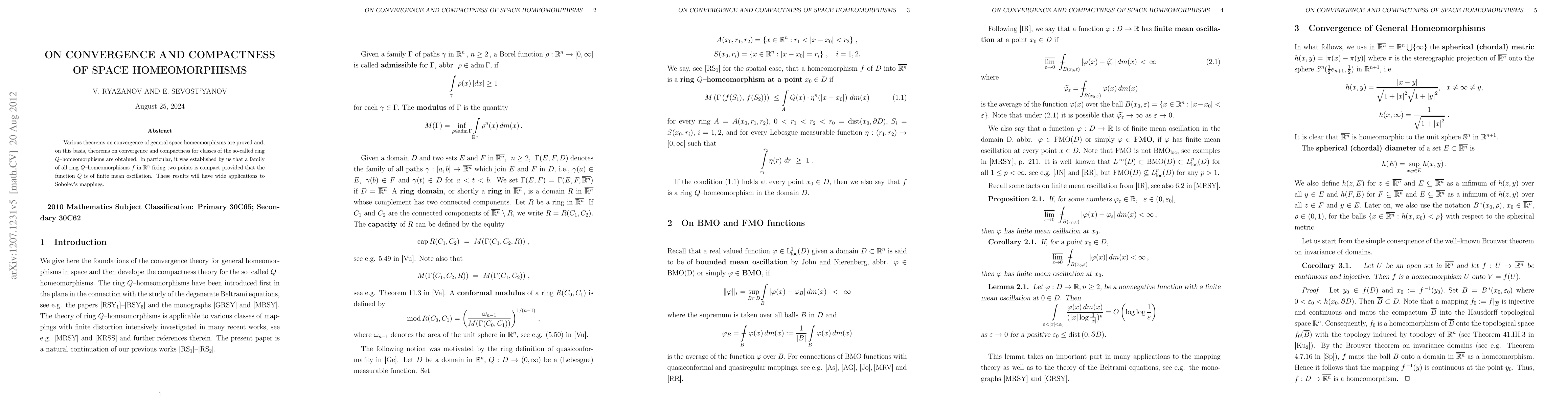 Various theorems on convergence of general space homeomorphisms are proved and, on this basis, theorems on convergence and compactness for classes of the so-called ring $Q$--homeomorphisms are obtained. In particular, it was established by us that a family of all ring $Q$--homeomorphisms $f$ in ${\Bbb R}^n$ fixing two points is compact provided that the function $Q$ is of finite mean oscillation. These results will have wide applications to Sobolev's mappings.