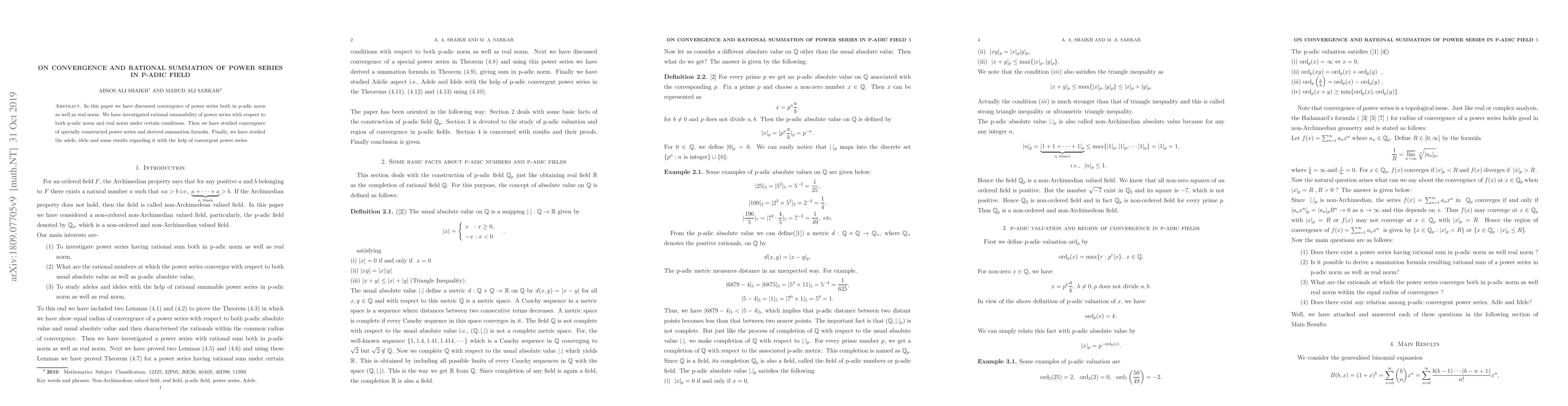 This paper examines the convergence of power series in both p-adic and real norms, exploring rational summability under specific conditions, deriving a summation formula for specially constructed series, and investigating adele and ideles using convergent power series.