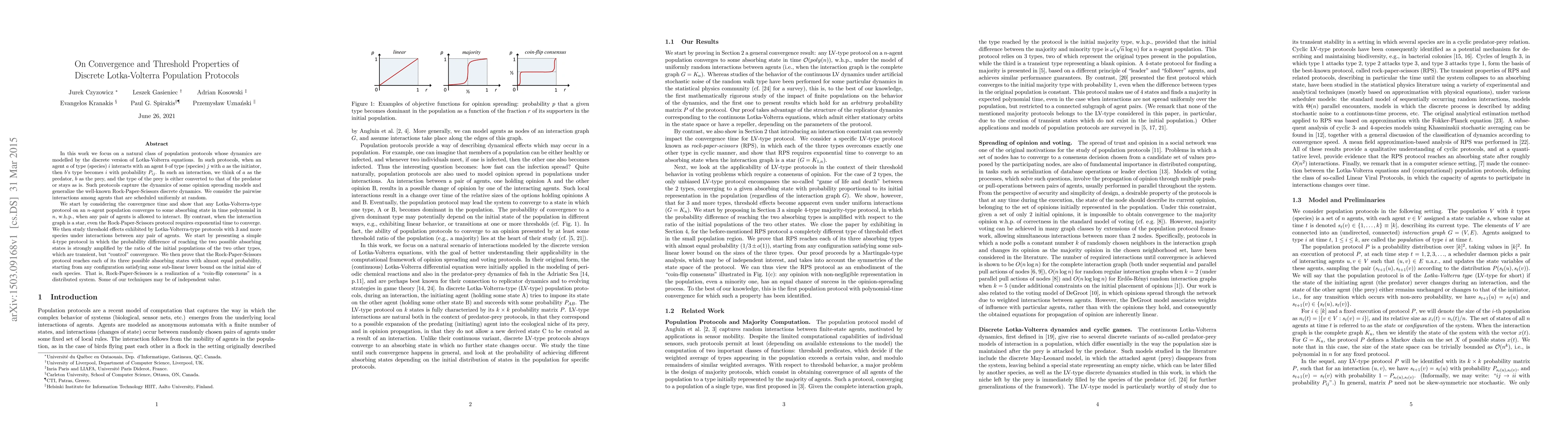 In this work we focus on a natural class of population protocols whose dynamics are modelled by the discrete version of Lotka-Volterra equations. In such protocols, when an agent $a$ of type (species) $i$ interacts with an agent $b$ of type (species) $j$ with $a$ as the initiator, then $b$'s type becomes $i$ with probability $P\_{ij}$. In such an interaction, we think of $a$ as the predator, $b$ as the prey, and the type of the prey is either converted to that of the predator or stays as is. Such protocols capture the dynamics of some opinion spreading models and generalize the well-known Rock-Paper-Scissors discrete dynamics. We consider the pairwise interactions among agents that are scheduled uniformly at random. We start by considering the convergence time and show that any Lotka-Volterra-type protocol on an $n$-agent population converges to some absorbing state in time polynomial in $n$, w.h.p., when any pair of agents is allowed to interact. By contrast, when the interaction graph is a star, even the Rock-Paper-Scissors protocol requires exponential time to converge. We then study threshold effects exhibited by Lotka-Volterra-type protocols with 3 and more species under interactions between any pair of agents. We start by presenting a simple 4-type protocol in which the probability difference of reaching the two possible absorbing states is strongly amplified by the ratio of the initial populations of the two other types, which are transient, but "control" convergence. We then prove that the Rock-Paper-Scissors protocol reaches each of its three possible absorbing states with almost equal probability, starting from any configuration satisfying some sub-linear lower bound on the initial size of each species. That is, Rock-Paper-Scissors is a realization of a "coin-flip consensus" in a distributed system. Some of our techniques may be of independent value.