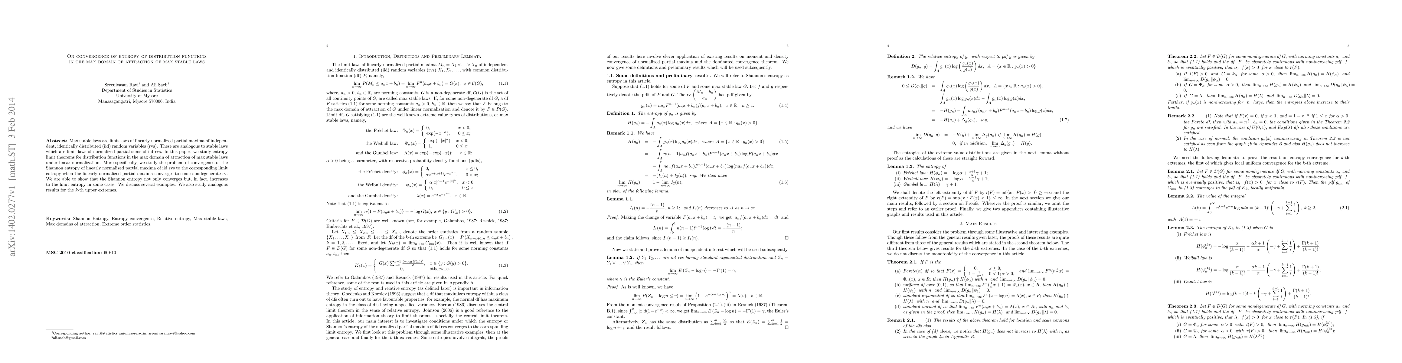 This paper investigates entropy convergence for distribution functions in the max domain of attraction of max stable laws under linear normalization. It demonstrates that the Shannon entropy of normalized partial maxima converges and, in certain cases, increases to the limit entropy, providing examples and discussing results for k-th upper extremes.