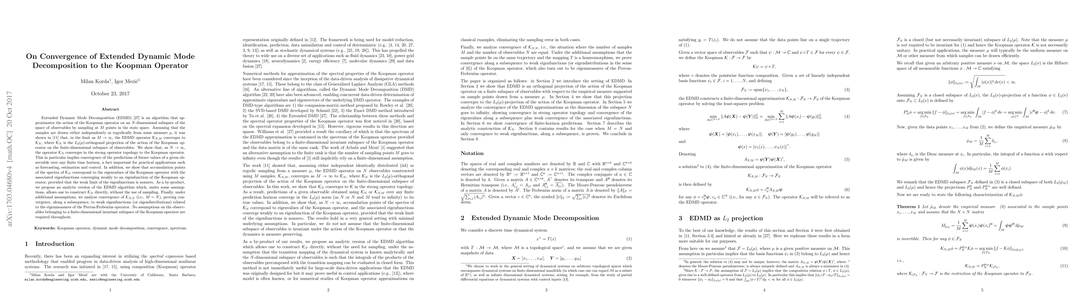 This paper demonstrates the convergence of Extended Dynamic Mode Decomposition (EDMD) to the Koopman operator as the number of sampled data points and the dimensionality of the subspace both approach infinity. It also introduces an analytic version of EDMD and analyzes convergence under specific conditions, highlighting its practical applications in forecasting and control.