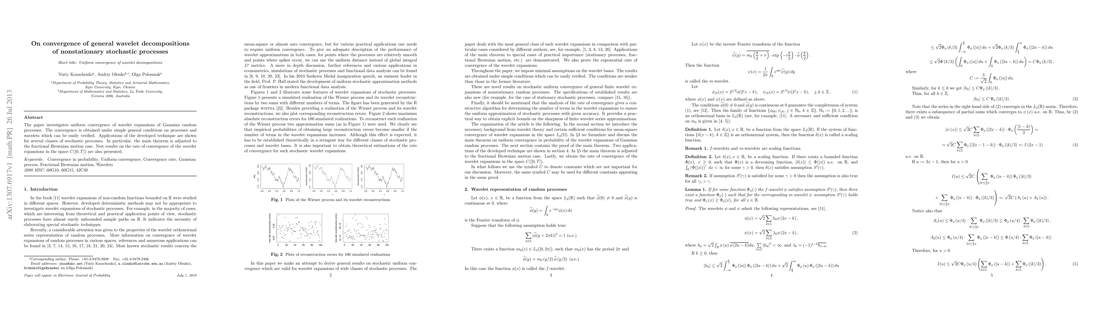 This paper studies the uniform convergence of wavelet expansions for Gaussian random processes under general conditions, demonstrating applications for various stochastic processes, including fractional Brownian motion, and presenting new results on the rate of convergence in the space $C([0,T])$.
