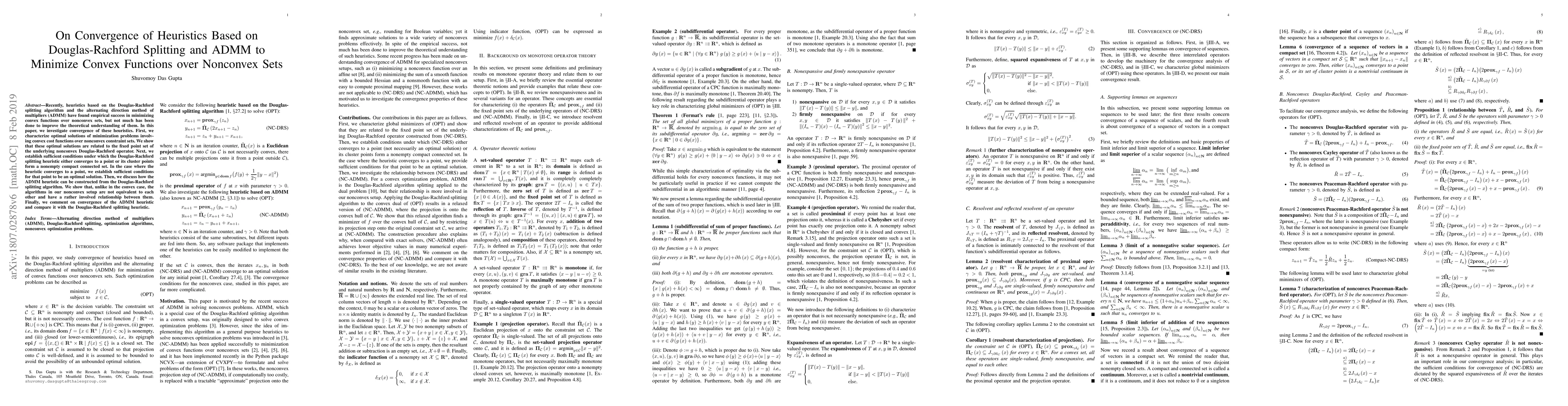 This paper investigates the convergence of heuristics based on Douglas-Rachford splitting and ADMM for minimizing convex functions over nonconvex sets, establishing conditions under which these heuristics converge and characterizing their optimal solutions. It highlights the distinct relationship between these heuristics in nonconvex settings.