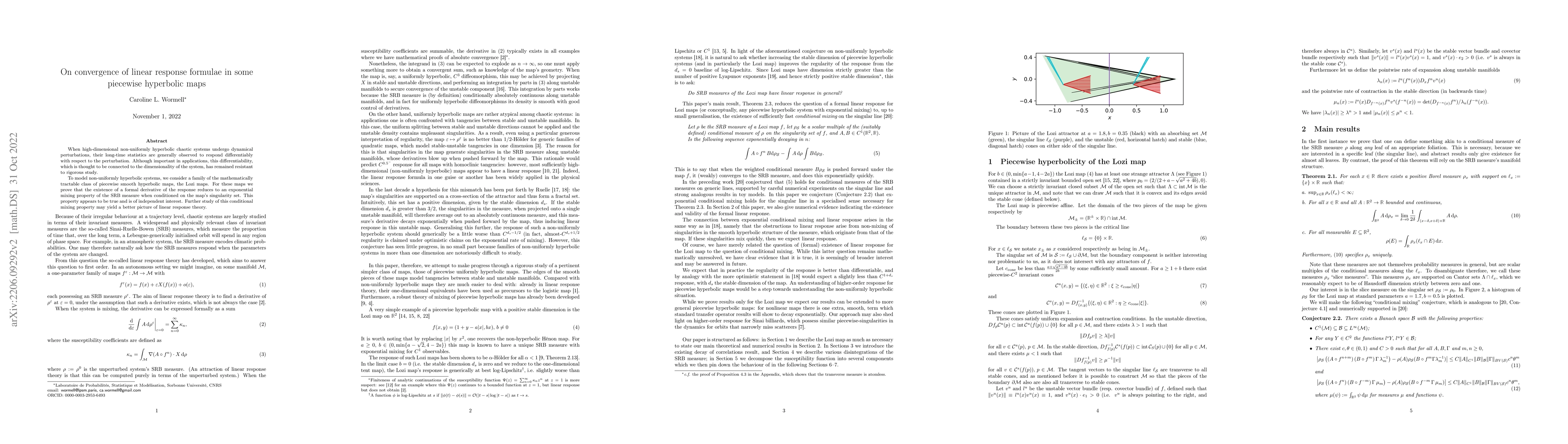 When high-dimensional non-uniformly hyperbolic chaotic systems undergo dynamical perturbations, their long-time statistics are generally observed to respond differentiably with respect to the perturbation. Although important in applications, this differentiability, which is thought to be connected to the dimensionality of the system, has remained resistant to rigorous study. To model non-uniformly hyperbolic systems, we consider a family of the mathematically tractable class of piecewise smooth hyperbolic maps, the Lozi maps. For these maps we prove that the existence of a formal derivative of the response reduces to an exponential mixing property of the SRB measure when conditioned on the map's singularity set. This property appears to be true and is of independent interest. Further study of this conditional mixing property may yield a better picture of linear response theory.