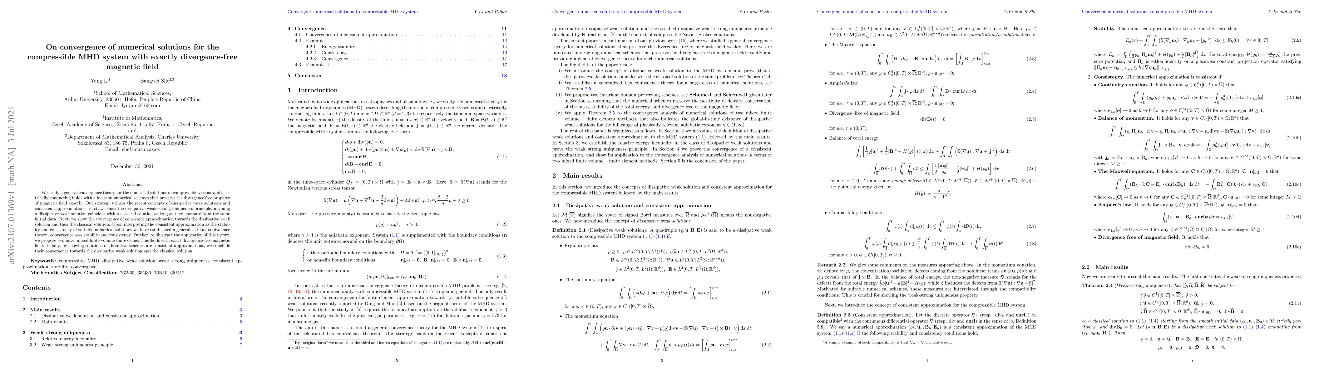 This paper develops a convergence theory for numerical solutions of compressible MHD systems, focusing on schemes that maintain the divergence-free property of the magnetic field. It establishes a Lax equivalence theory linking convergence, stability, and consistency, and proposes two novel mixed finite volume-finite element methods that demonstrate convergence to the classical solution.