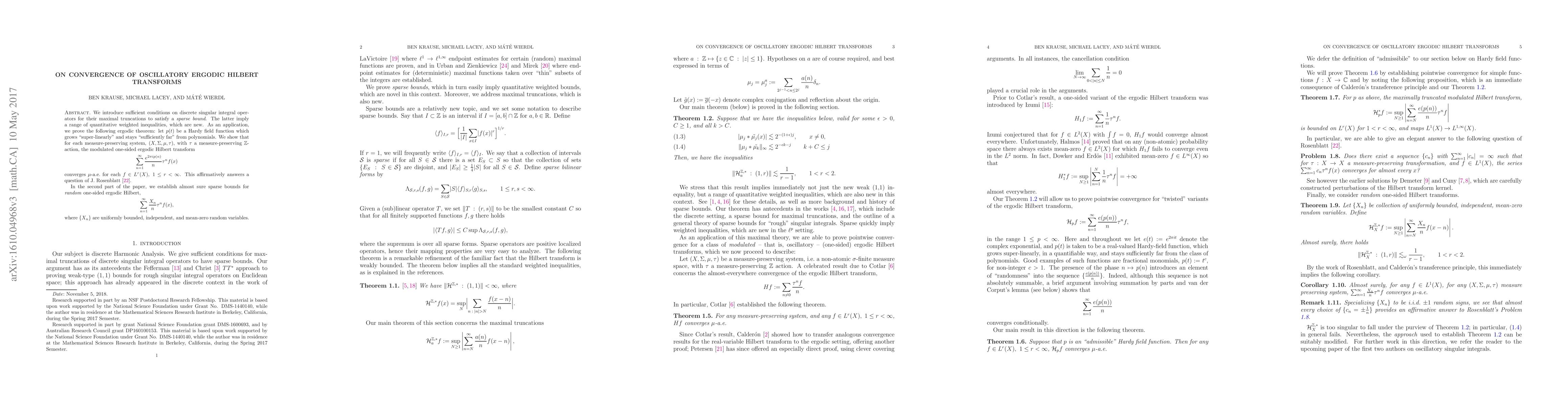 We introduce sufficient conditions on discrete singular integral operators for their maximal truncations to satisfy a sparse bound. The latter imply a range of quantitative weighted inequalities, which are new. As an application, we prove the following ergodic theorem: let $p(t)$ be a Hardy field function which grows "super-linearly" and stays "sufficiently far" from polynomials. We show that for each measure-preserving system, $(X,\Sigma,\mu,\tau)$, with $\tau$ a measure-preserving $\mathbb{Z}$-action, the modulated one-sided ergodic Hilbert transform \[ \sum_{n=1}^\infty \frac{e^{2\pi i p(n)}}{n} \tau^n f(x) \] converges $\mu$-a.e. for each $f \in L^r(X), \ 1 \leq r < \infty$. This affirmatively answers a question of J. Rosenblatt. In the second part of the paper, we establish almost sure sparse bounds for random one-sided ergodic Hilbert transforms, \[ \sum_{n=1}^\infty \frac{X_n}{n} \tau^n f(x), \] where $\{ X_n \}$ are uniformly bounded, independent, and mean-zero random variables.