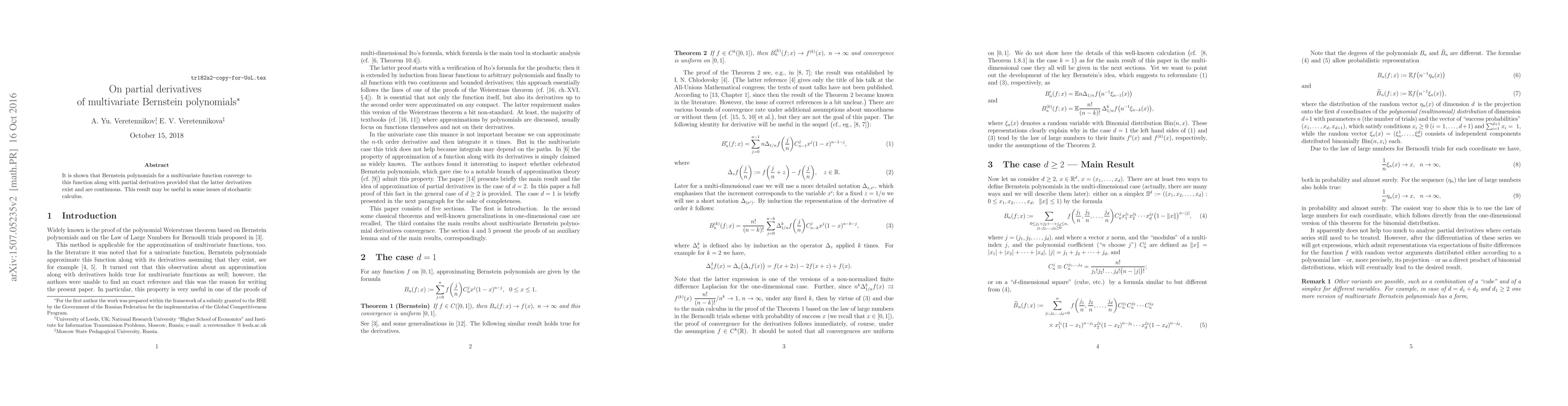 Summary: The paper demonstrates that Bernstein polynomials for multivariate functions converge uniformly to the function and all its continuous partial derivatives. This result has implications for stochastic calculus, particularly in proving the multidimensional Ito's formula.