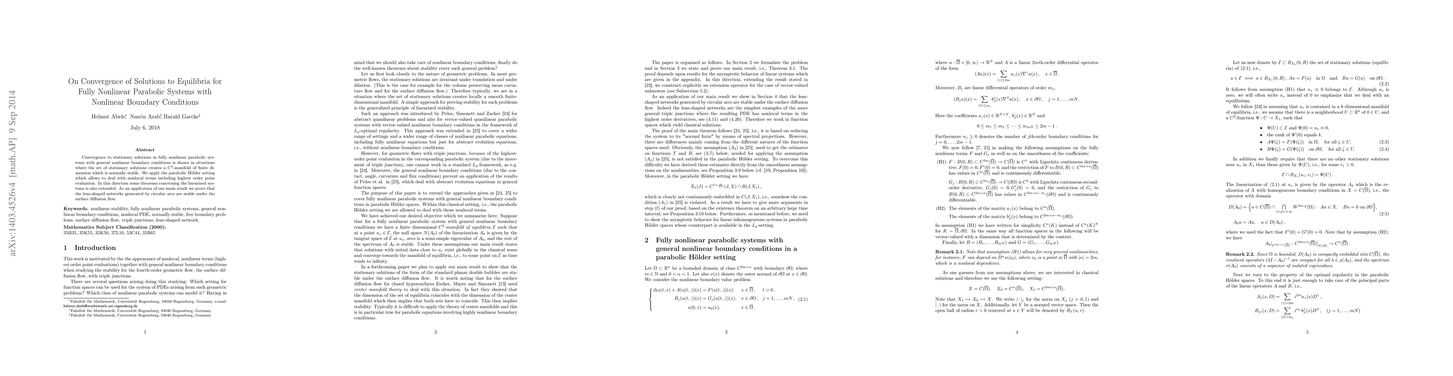 Convergence to stationary solutions in fully nonlinear parabolic systems with general nonlinear boundary conditions is shown in situations where the set of stationary solutions creates a $C^2$-manifold of finite dimension which is normally stable. We apply the parabolic H\"older setting which allows to deal with nonlocal terms including highest order point evaluation. In this direction some theorems concerning the linearized systems is also extended. As an application of our main result we prove that the lens-shaped networks generated by circular arcs are stable under the surface diffusion flow.
