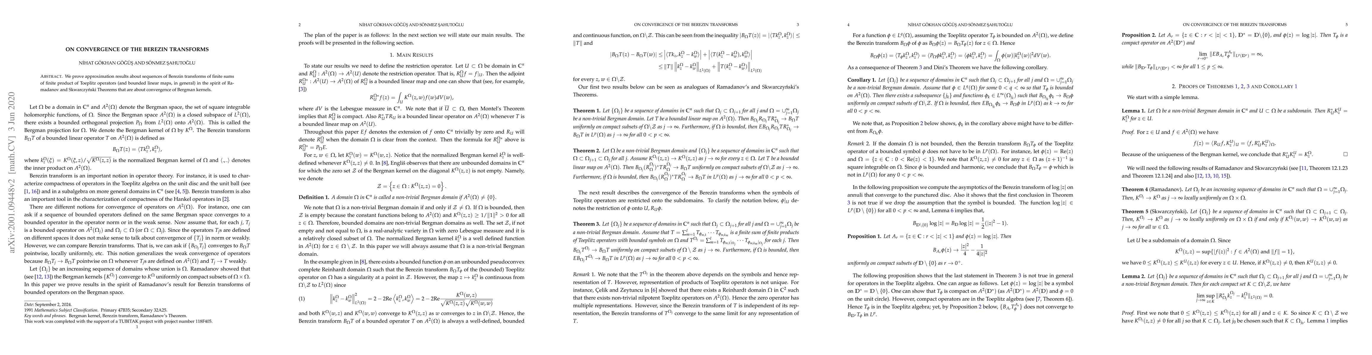 We prove approximation results about sequences of Berezin transforms of finite sums of finite product of Toeplitz operators (and bounded linear maps, in general) in the spirit of Ramadanov and Skwarczynski theorems that are about convergence of Bergman kernels.