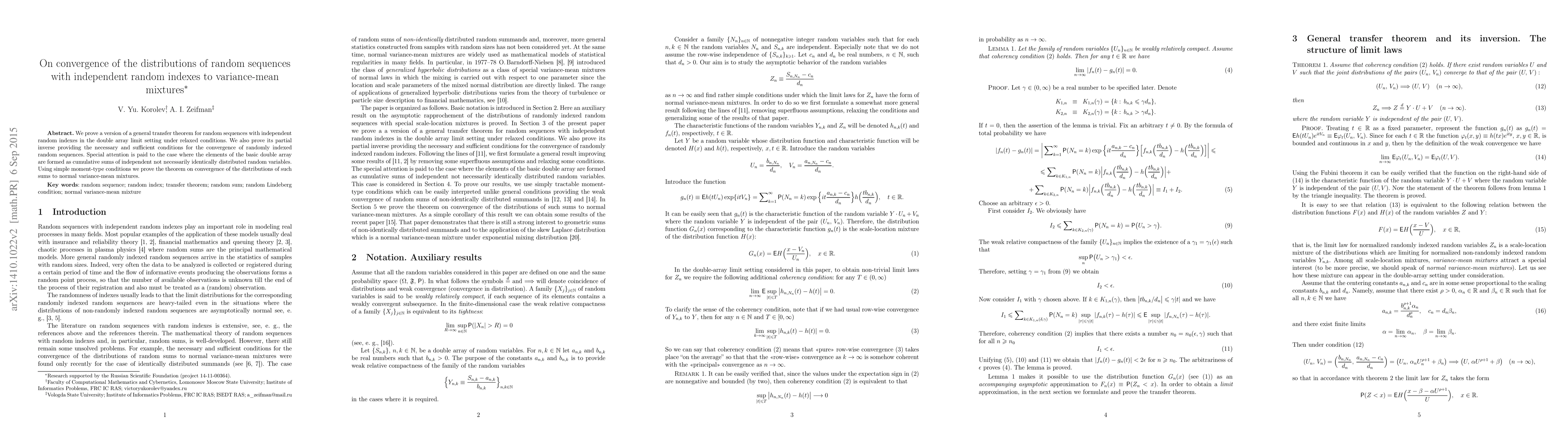 The paper establishes a general transfer theorem for convergence of random sequences with independent random indexes to variance-mean mixtures under relaxed conditions, and also provides necessary and sufficient conditions for such convergence, specifically for cumulative sums of independent random variables converging to normal variance-mean mixtures.