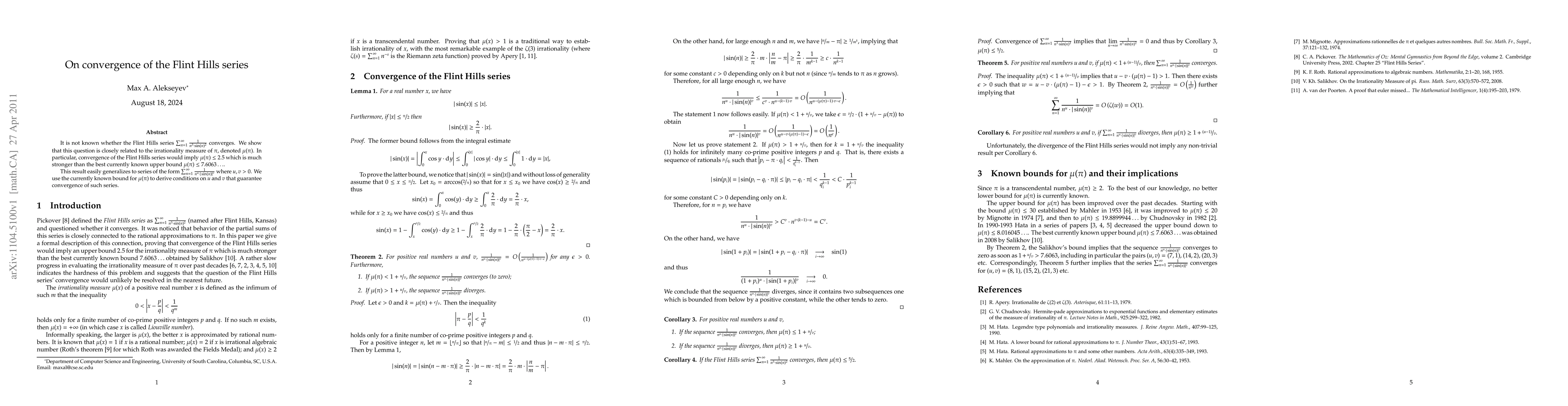 This paper investigates the convergence of the Flint Hills series, showing its relation to the irrationality measure of $\pi$. It demonstrates that the series' convergence would imply a significantly stronger upper bound for $\mu(\pi)$ than currently known.