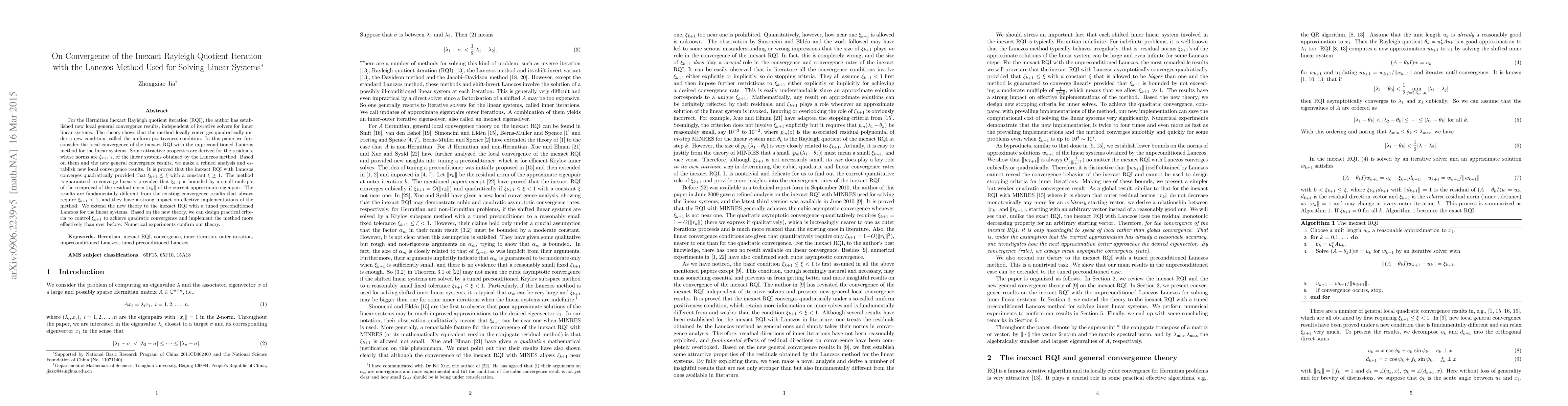 This paper establishes new local convergence results for the inexact Rayleigh Quotient Iteration (RQI) combined with the Lanczos method for solving linear systems. It proves quadratic convergence under a uniform positiveness condition, differing from existing results that require $\xi_{k+1}<1$. Numerical experiments validate the refined theory and practical criteria for achieving quadratic convergence.