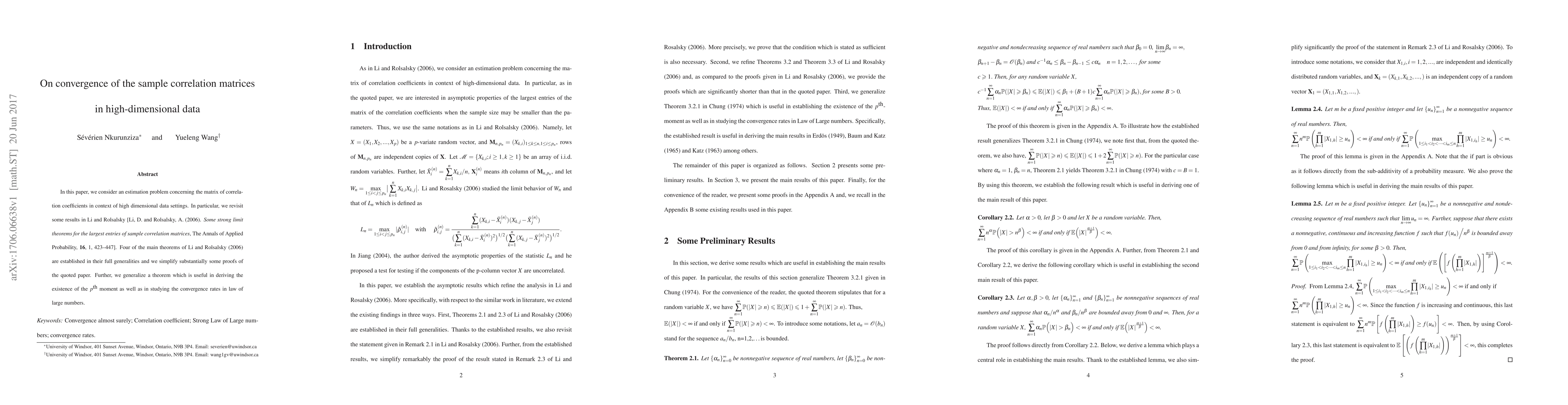 This paper revisits and simplifies proofs of four main theorems from Li and Rolsalsky (2006) on the convergence of sample correlation matrices in high-dimensional data, and generalizes a theorem related to the existence of moments and convergence rates.