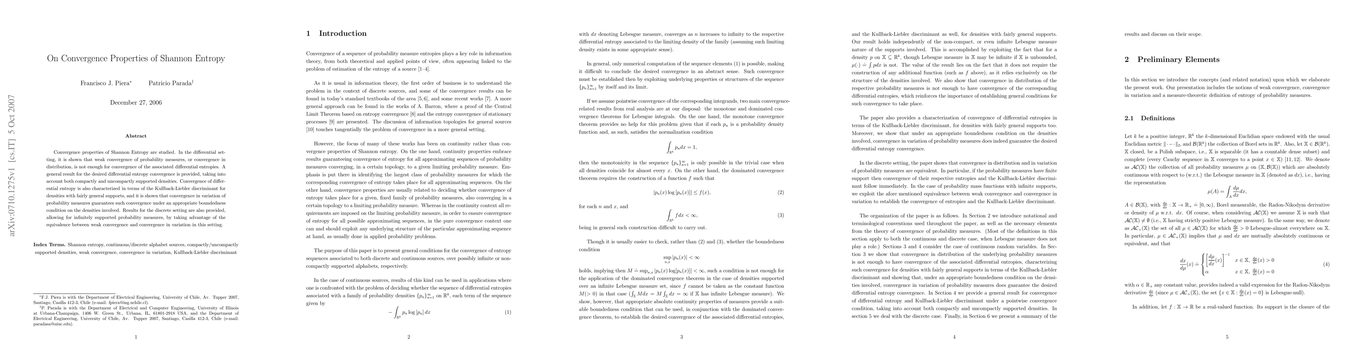 The paper investigates the convergence properties of Shannon Entropy in both continuous and discrete settings, showing that weak convergence is not enough for convergence of differential entropies but providing a general result for convergence under specific conditions.