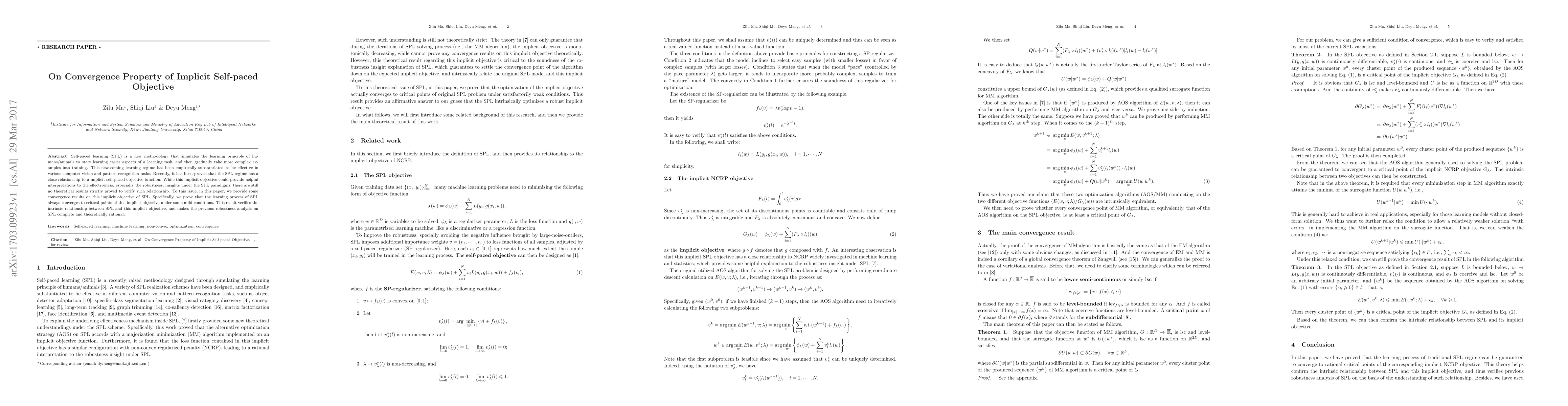 Self-paced learning (SPL) is a new methodology that simulates the learning principle of humans/animals to start learning easier aspects of a learning task, and then gradually take more complex examples into training. This new-coming learning regime has been empirically substantiated to be effective in various computer vision and pattern recognition tasks. Recently, it has been proved that the SPL regime has a close relationship to a implicit self-paced objective function. While this implicit objective could provide helpful interpretations to the effectiveness, especially the robustness, insights under the SPL paradigms, there are still no theoretical results strictly proved to verify such relationship. To this issue, in this paper, we provide some convergence results on this implicit objective of SPL. Specifically, we prove that the learning process of SPL always converges to critical points of this implicit objective under some mild conditions. This result verifies the intrinsic relationship between SPL and this implicit objective, and makes the previous robustness analysis on SPL complete and theoretically rational.
