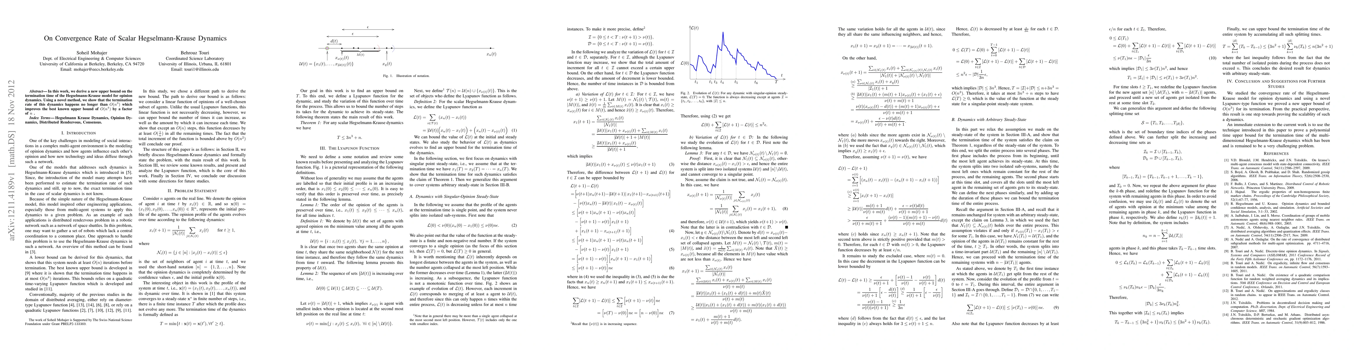 In this work, we derive a new upper bound on the termination time of the Hegselmann-Krause model for opinion dynamics. Using a novel method, we show that the termination rate of this dynamics happens no longer than $O(n^3)$ which improves the best known upper bound of $O(n^4)$ by a factor of $n$ .