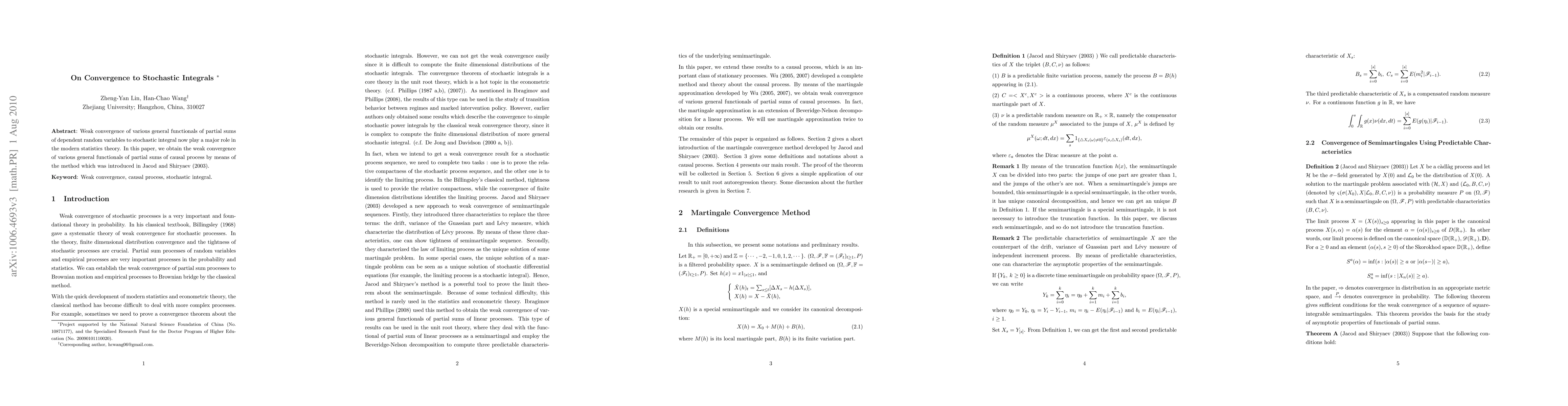 This paper establishes weak convergence of partial sums of causal processes to stochastic integrals using a method introduced in Jacod and Shiryaev (2003). It contributes to modern statistics theory by providing a new tool for analyzing dependent random variables.