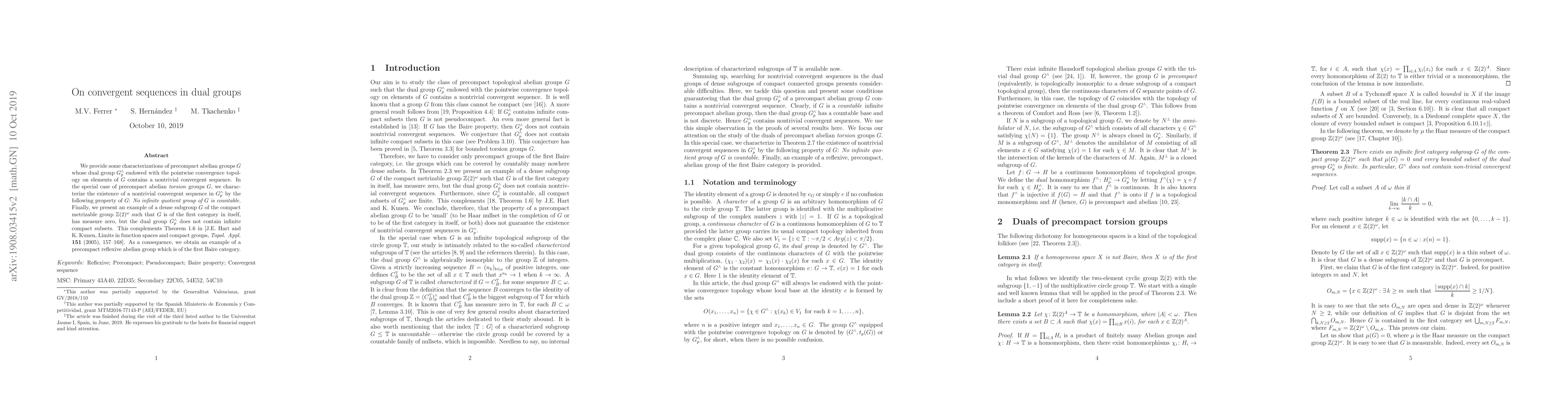 The paper investigates convergent sequences in dual groups of precompact abelian groups, focusing on characterizations and examples that reveal the existence of nontrivial convergent sequences under specific conditions.