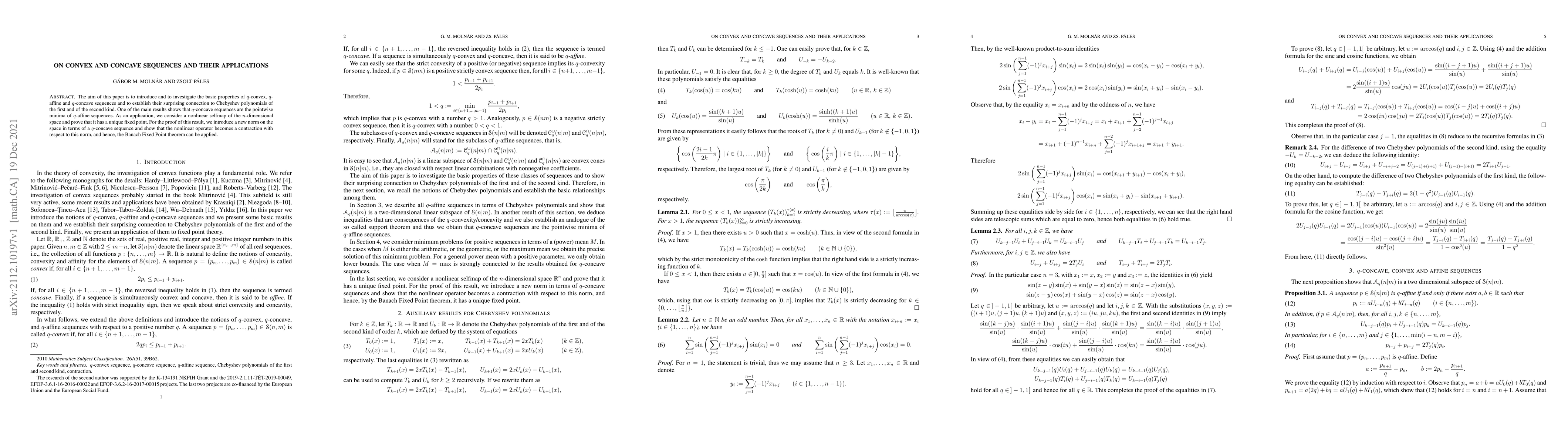 The aim of this paper is to introduce and to investigate the basic properties of $q$-convex, $q$-affine and $q$-concave sequences and to establish their surprising connection to Chebyshev polynomials of the first and of the second kind. One of the main results shows that $q$-concave sequences are the pointwise minima of $q$-affine sequences. As an application, we consider a nonlinear selfmap of the $n$-dimensional space and prove that it has a unique fixed point. For the proof of this result, we introduce a new norm on the space in terms of a $q$-concave sequence and show that the nonlinear operator becomes a contraction with respect to this norm, and hence, the Banach Fixed Point theorem can be applied.