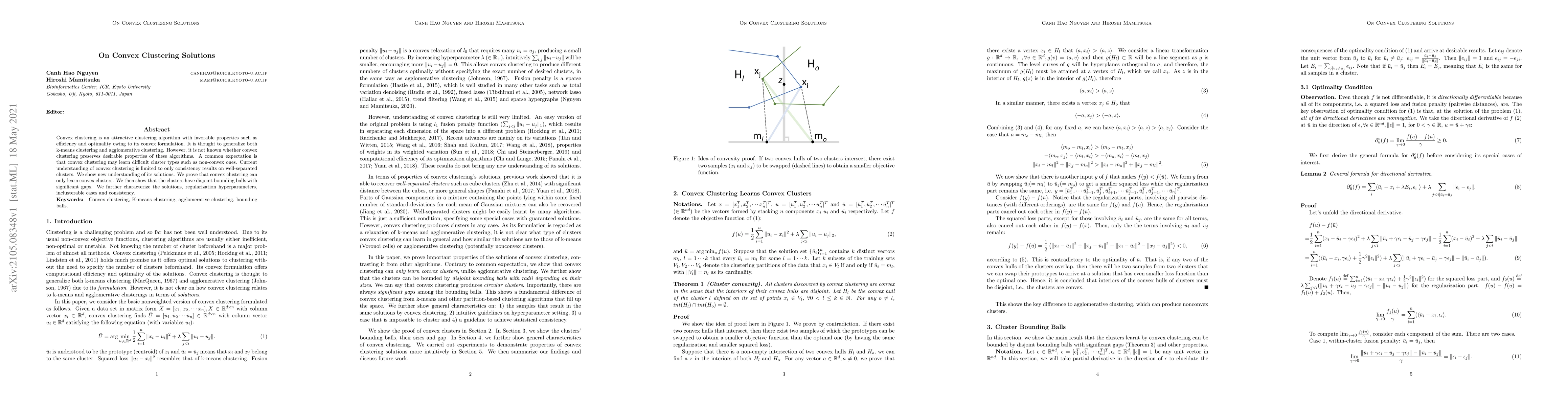 This paper explores the properties of convex clustering solutions, proving that convex clustering can only learn convex clusters with disjoint bounding balls. It also characterizes the solutions, regularization hyperparameters, inclusterable cases, and consistency, addressing the limitations of current understanding.