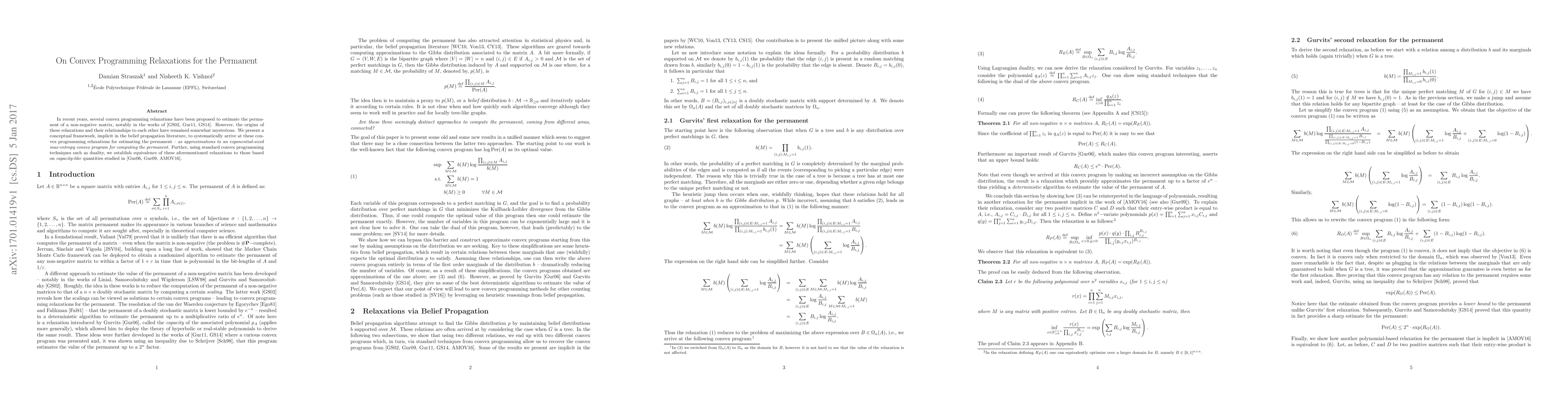 This paper introduces a conceptual framework to systematically derive convex programming relaxations for estimating the permanent of a non-negative matrix, linking them to an exponential-sized max-entropy convex program. It also establishes the equivalence of these relaxations to those based on capacity-like quantities through standard convex programming techniques.