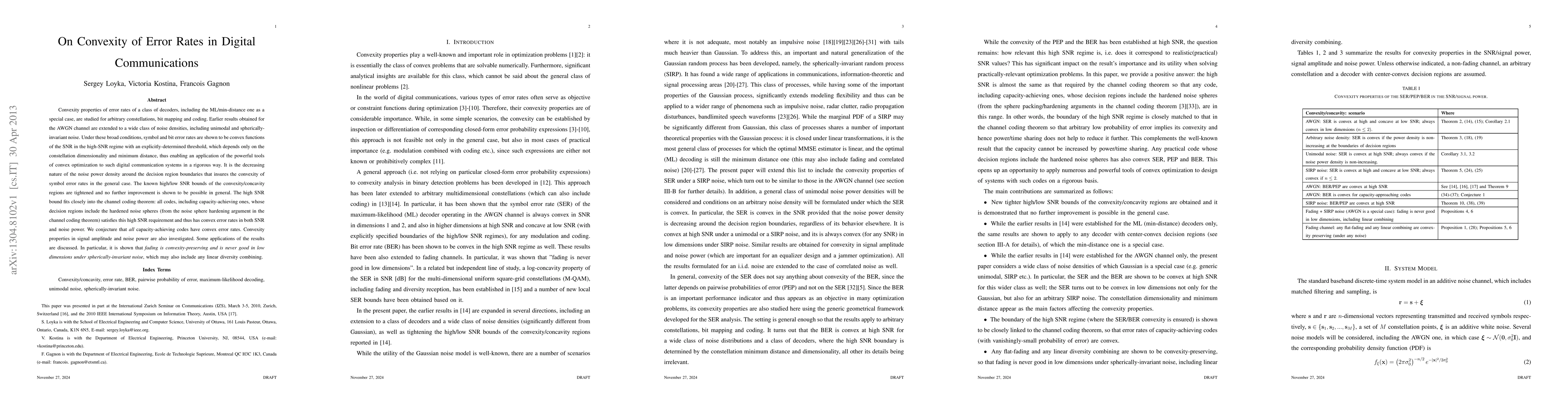 Convexity properties of error rates of a class of decoders, including the ML/min-distance one as a special case, are studied for arbitrary constellations, bit mapping and coding. Earlier results obtained for the AWGN channel are extended to a wide class of noise densities, including unimodal and spherically-invariant noise. Under these broad conditions, symbol and bit error rates are shown to be convex functions of the SNR in the high-SNR regime with an explicitly-determined threshold, which depends only on the constellation dimensionality and minimum distance, thus enabling an application of the powerful tools of convex optimization to such digital communication systems in a rigorous way. It is the decreasing nature of the noise power density around the decision region boundaries that insures the convexity of symbol error rates in the general case. The known high/low SNR bounds of the convexity/concavity regions are tightened and no further improvement is shown to be possible in general. The high SNR bound fits closely into the channel coding theorem: all codes, including capacity-achieving ones, whose decision regions include the hardened noise spheres (from the noise sphere hardening argument in the channel coding theorem) satisfies this high SNR requirement and thus has convex error rates in both SNR and noise power. We conjecture that all capacity-achieving codes have convex error rates. Convexity properties in signal amplitude and noise power are also investigated. Some applications of the results are discussed. In particular, it is shown that fading is convexity-preserving and is never good in low dimensions under spherically-invariant noise, which may also include any linear diversity combining.