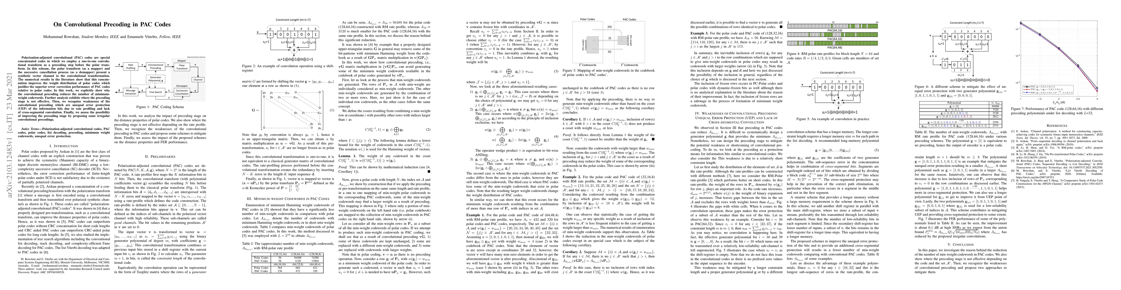 Researchers investigate how convolutional precoding improves polarization-adjusted convolutional (PAC) codes' error correction performance, finding that it reduces the number of minimum-weight codewords but has weaknesses in unequal error protection and cross-segmental convolution.