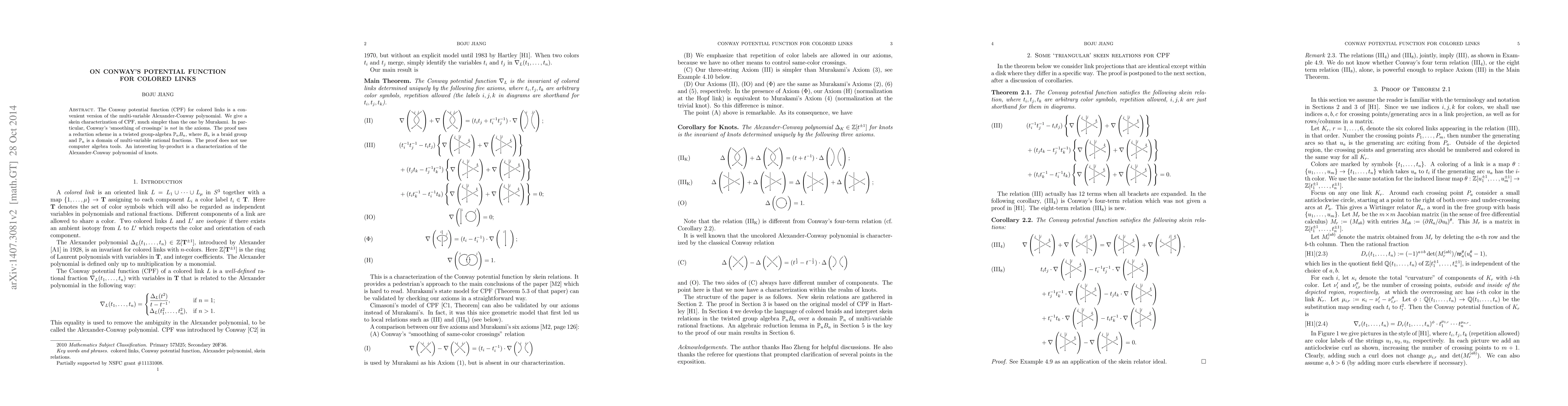 The Conway potential function (CPF) for colored links is a convenient version of the multi-variable Alexander-Conway polynomial. We give a skein characterization of CPF, much simpler than the one by Murakami. In particular, Conway's `smoothing of crossings' is not in the axioms. The proof uses a reduction scheme in a twisted group-algebra $\mathbb P_nB_n$, where $B_n$ is a braid group and $\mathbb P_n$ is a domain of multi-variable rational fractions. The proof does not use computer algebra tools. An interesting by-product is a characterization of the Alexander-Conway polynomial of knots.