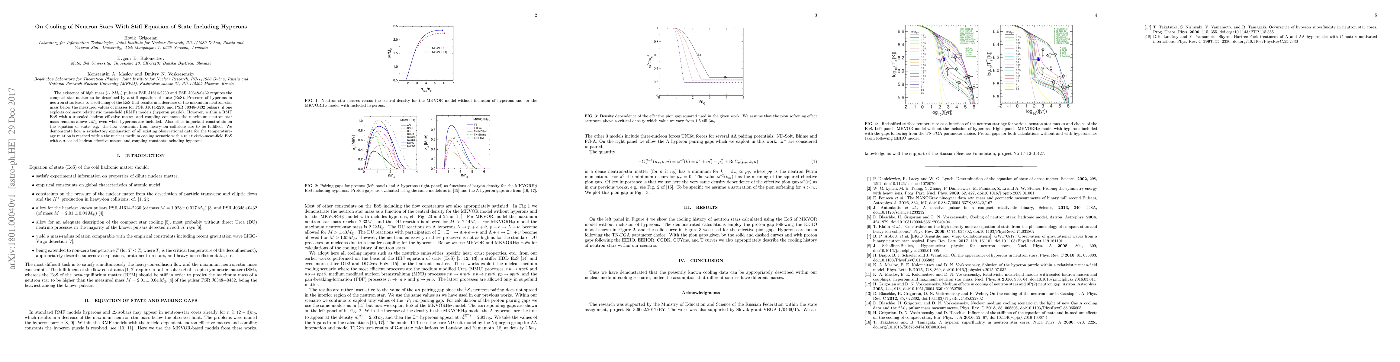 This paper investigates neutron star cooling with a stiff equation of state (EoS) that accommodates high-mass pulsars and includes hyperons, resolving the hyperon puzzle. It demonstrates that a relativistic-mean-field EoS with sigma-scaled hadron parameters can maintain neutron star masses above $2M_{\odot}$ while satisfying observational constraints and explaining the temperature-age relation.