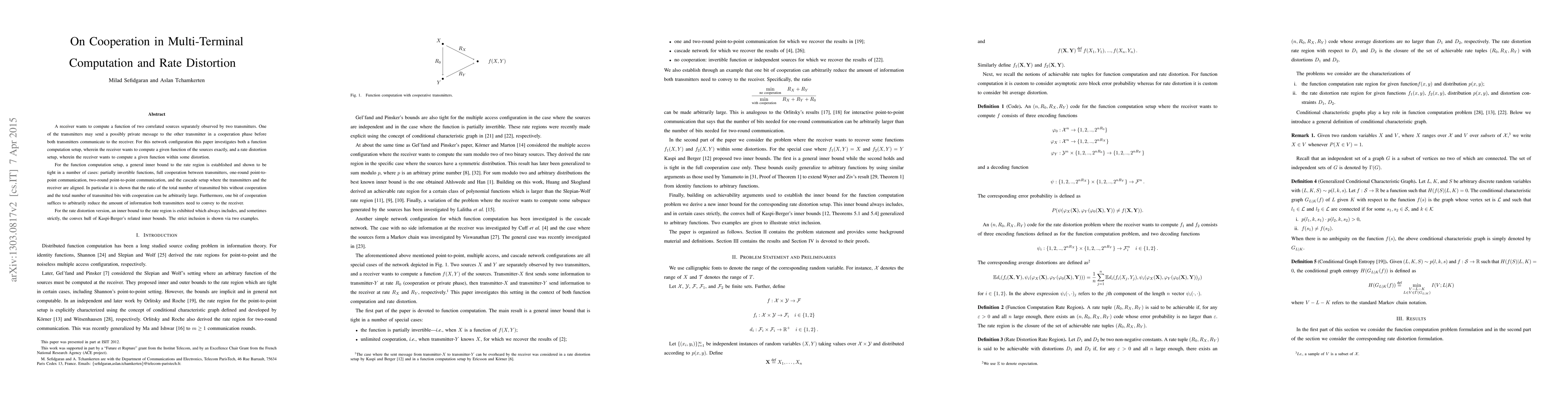Researchers investigated cooperation in multi-terminal computation and rate distortion, finding that one bit of cooperation can reduce information transmission by a large amount and establishing tight bounds for rate regions in both exact function computation and rate distortion scenarios.