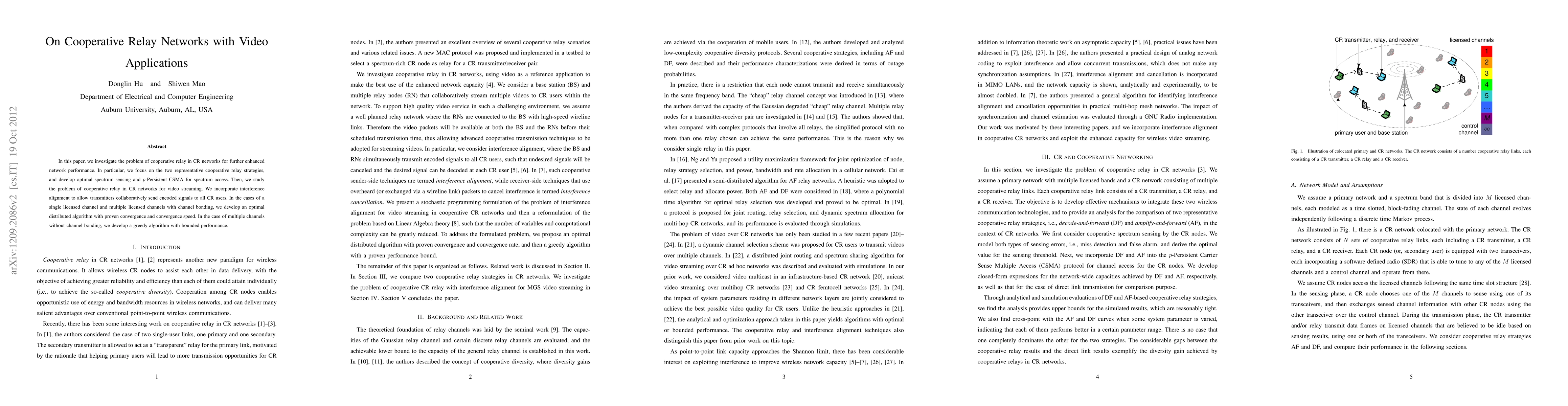 In this paper, we investigate the problem of cooperative relay in CR networks for further enhanced network performance. In particular, we focus on the two representative cooperative relay strategies, and develop optimal spectrum sensing and $p$-Persistent CSMA for spectrum access. Then, we study the problem of cooperative relay in CR networks for video streaming. We incorporate interference alignment to allow transmitters collaboratively send encoded signals to all CR users. In the cases of a single licensed channel and multiple licensed channels with channel bonding, we develop an optimal distributed algorithm with proven convergence and convergence speed. In the case of multiple channels without channel bonding, we develop a greedy algorithm with bounded performance.