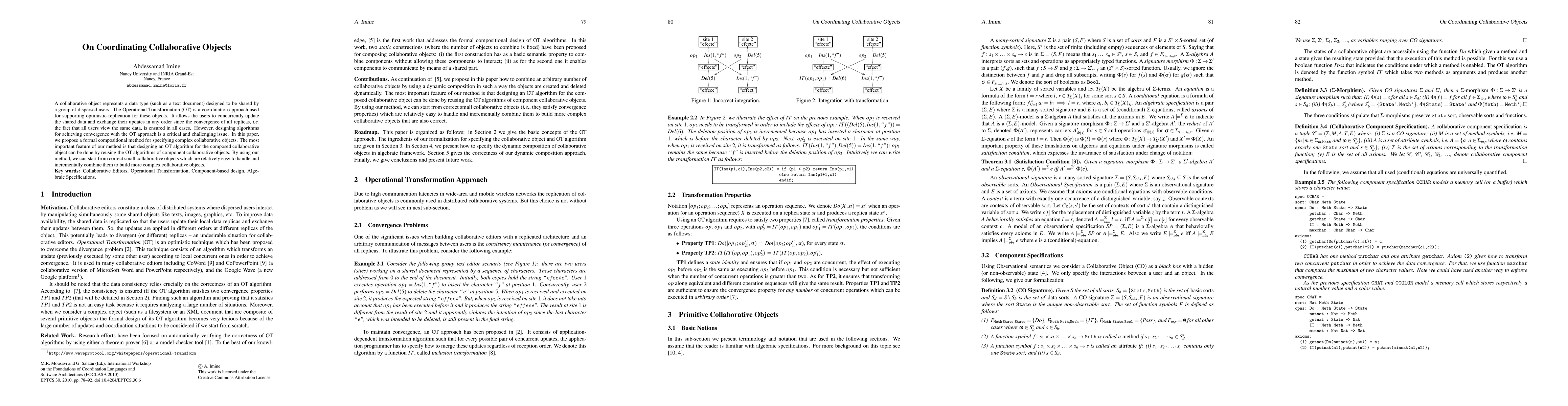 This paper proposes a formal compositional method for specifying complex collaborative objects using Operational Transformation, allowing the reuse of existing OT algorithms for component objects to ensure convergence and concurrency in shared data updates. The method facilitates building complex collaborative objects incrementally from simpler, manageable parts.