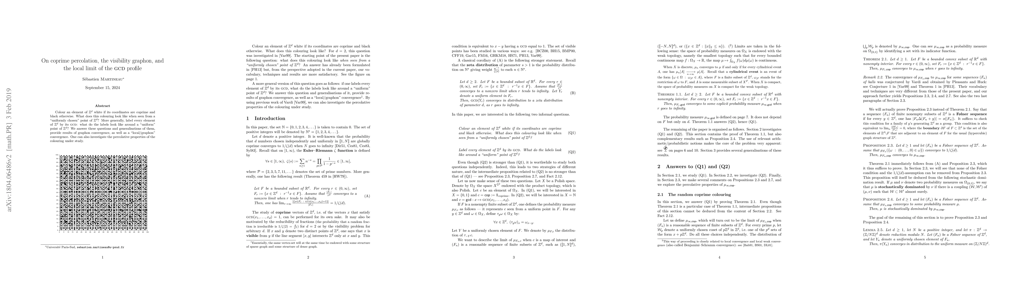 Colour an element of $\mathbb{Z}^d$ white if its coordinates are coprime and black otherwise. What does this colouring look like when seen from a "uniformly chosen" point of $\mathbb{Z}^d$? More generally, label every element of $\mathbb{Z}^d$ by its GCD: what do the labels look like around a "uniform" point of $\mathbb{Z}^d$? We answer these questions and generalisations of them, provide results of graphon convergence, as well as a "local/graphon" convergence. One can also investigate the percolative properties of the colouring under study.