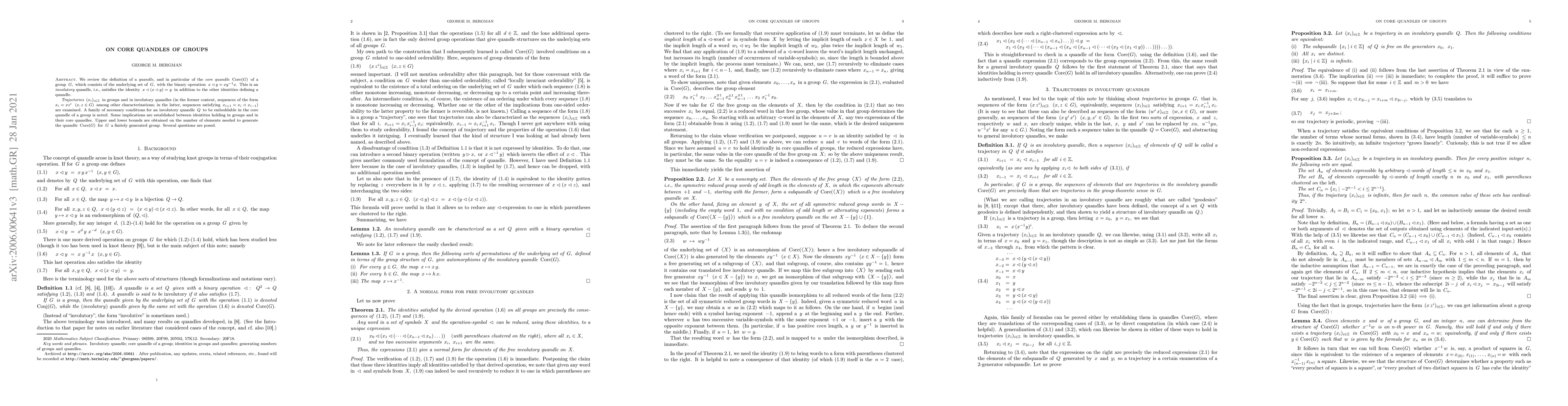 We review the definition of a quandle, and in particular of the core quandle $\mathrm{Core}(G)$ of a group $G$, which consists of the underlying set of $G$, with the binary operation $x\lhd y = x y^{-1} x$. This is an involutory quandle, i.e., satisfies the identity $x\lhd (x\lhd y) = y$ in addition to the other identities defining a quandle. Trajectories $(x_i)_{i\in\mathbb{Z}}$ in groups and in involutory quandles (in the former context, sequences of the form $x_i = x z^i$ where $x,z\in G,$ among other characterizations; in the latter, sequences satisfying $x_{i+1}= x_i\lhd\,x_{i-1})$ are examined. A family of necessary conditions for an involutory quandle to be embeddable in the core quandle of a group is noted. Some implications are established between identities holding in groups and in their core quandles. Upper and lower bounds are obtained on the number of elements needed to generate the quandle $\mathrm{Core}(G)$ for $G$ a finitely generated group. Several questions are posed.