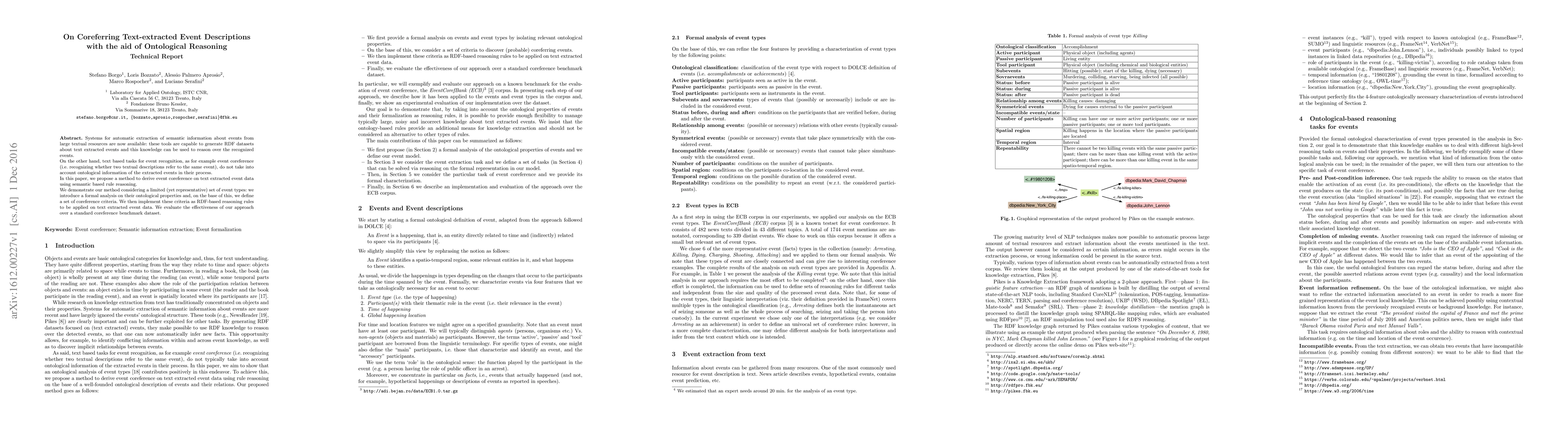 This paper proposes a method to enhance event coreference in text-extracted event descriptions using ontological reasoning and RDF datasets. It introduces formal ontological analysis and defines coreference criteria implemented as RDF-based reasoning rules, evaluated on a standard benchmark dataset.
