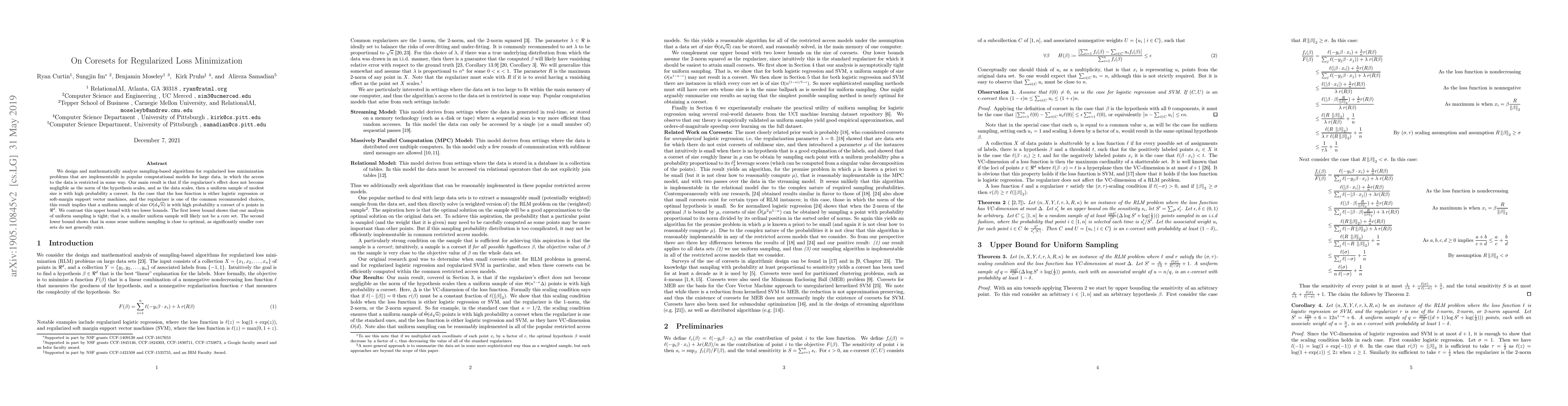 We design and mathematically analyze sampling-based algorithms for regularized loss minimization problems that are implementable in popular computational models for large data, in which the access to the data is restricted in some way. Our main result is that if the regularizer's effect does not become negligible as the norm of the hypothesis scales, and as the data scales, then a uniform sample of modest size is with high probability a coreset. In the case that the loss function is either logistic regression or soft-margin support vector machines, and the regularizer is one of the common recommended choices, this result implies that a uniform sample of size $O(d \sqrt{n})$ is with high probability a coreset of $n$ points in $\Re^d$. We contrast this upper bound with two lower bounds. The first lower bound shows that our analysis of uniform sampling is tight; that is, a smaller uniform sample will likely not be a core set. The second lower bound shows that in some sense uniform sampling is close to optimal, as significantly smaller core sets do not generally exist.