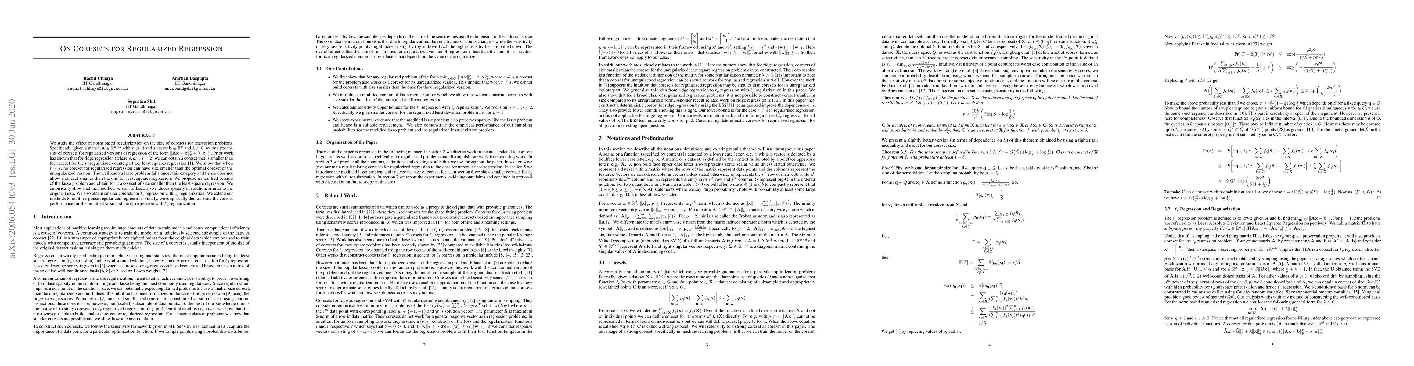 This paper investigates the effect of norm-based regularization on the size of coresets for regression problems, showing that regularized regressions like lasso do not allow smaller coresets than unregularized least squares regression. The authors propose a modified lasso problem and $\ell_p$ regression with $\ell_p$ regularization, achieving smaller coresets and empirically demonstrate the effectiveness of these methods.