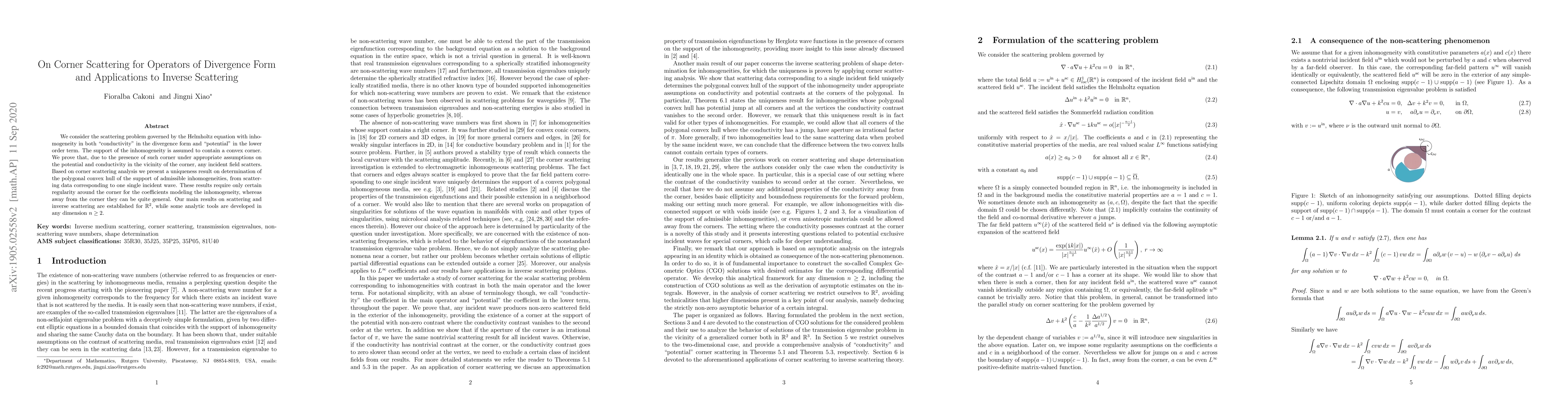 We consider the scattering problem governed by the Helmholtz equation with inhomogeneity in both `conductivity' in the divergence form and `potential' in the lower order term. The support of the inhomogeneity is assumed to contain a convex corner. We prove that, due to the presence of such corner under appropriate assumptions on the potential and conductivity in the vicinity of the corner, any incident field scatters. Based on corner scattering analysis we present a uniqueness result on determination of the polygonal convex hull of the support of admissible inhomogeneities, from scattering data corresponding to one single incident wave. These results require only certain regularity around the corner for the coefficients modeling the inhomogeneity, whereas away from the corner they can be quite general. Our main results on scattering and inverse scattering are established for $\mathbb{R}^2$, while some analytic tools are developed in any dimension $n\geq 2$.