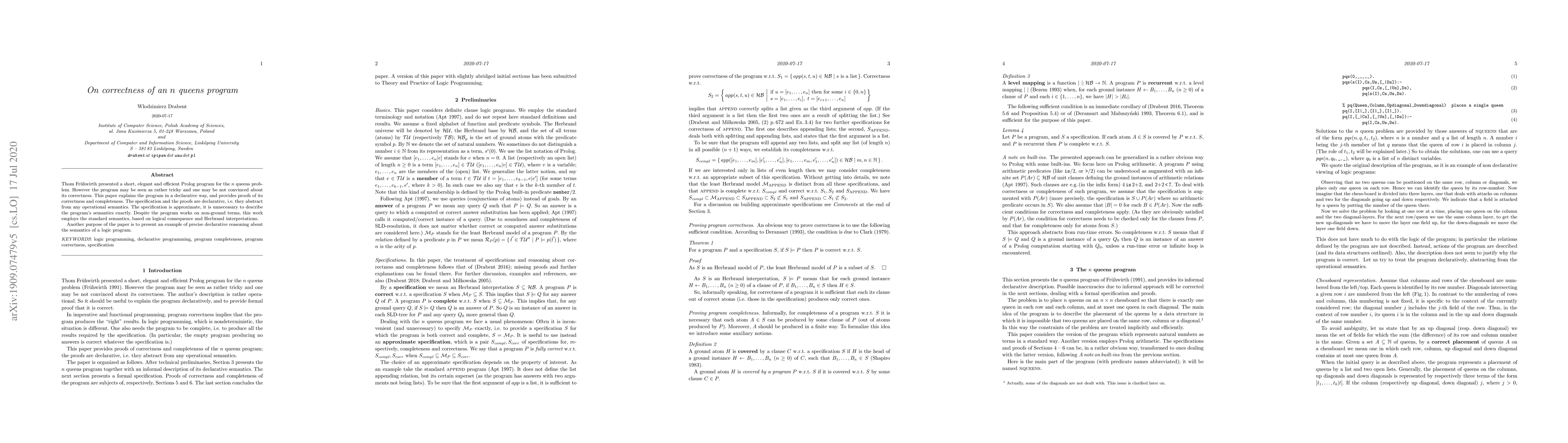 This paper clarifies and proves the correctness of Thom Frühwirth's Prolog program for the n queens problem, providing declarative explanations and proofs that abstract from operational semantics. It also serves as an example of precise declarative reasoning about logic programs.