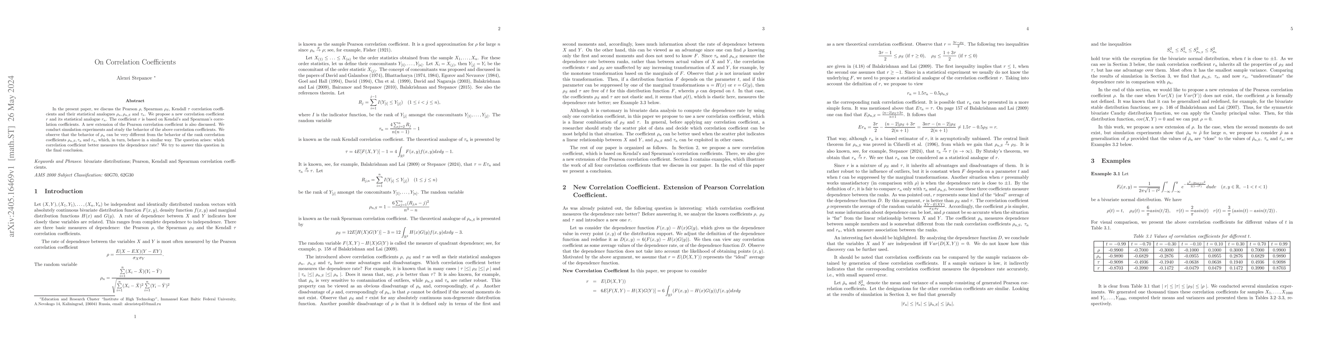 In the present paper, we discuss the Pearson, Spearman, Kendall correlation coefficients and their statistical analogues. We propose a new correlation coefficient r and its statistical analogue. The coefficient r is based on Kendal's and Spearman's correlation coefficients. A new extension of the Pearson correlation coefficient is also discussed. We conduct simulation experiments and study the behavior of the above correlation coefficients. We observe that the behavior of Pearson's sample correlation coefficient can be very different from the behavior of the rank correlation coefficients, which, in turn, behave in a similar way. The question arises: which correlation coefficient better measures the dependence rate? We try to answer this question in the final conclusion.