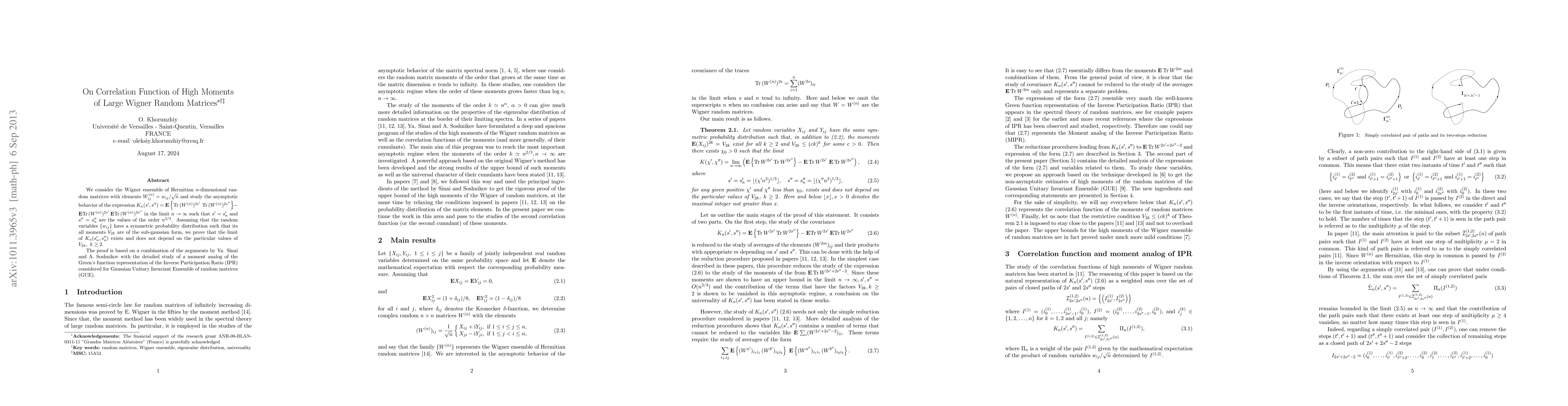This paper investigates the correlation function K(s',s") of high moments of Wigner random matrices, demonstrating that its limiting expression is independent of the matrix elements' moments. The proof integrates techniques from Sinai and Soshnikov with an analysis of the moment analog of the Inverse Participation Ratio in the Gaussian Unitary Invariant Ensemble (GUE).