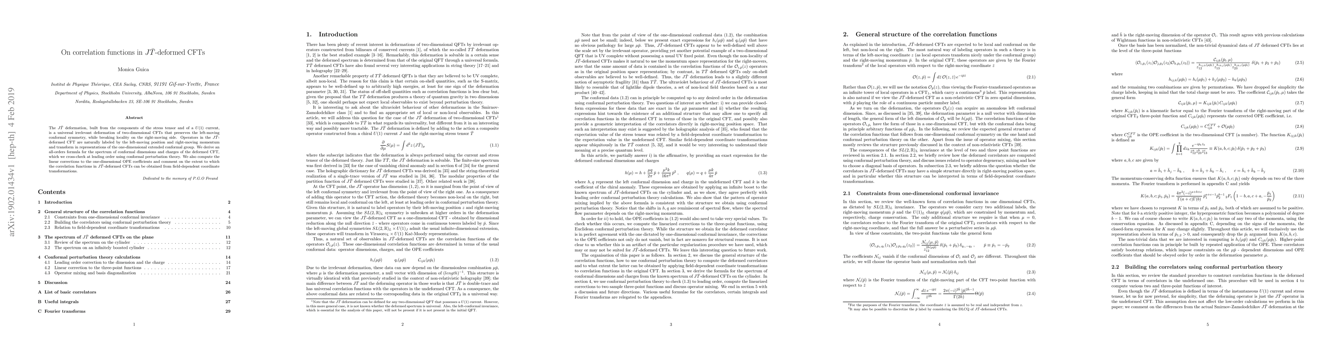 The paper presents an exact formula for the spectrum of conformal dimensions and charges in $J\bar{T}$-deformed CFTs, along with computations of linear corrections to OPE coefficients, providing a deeper understanding of the deformation's effects.