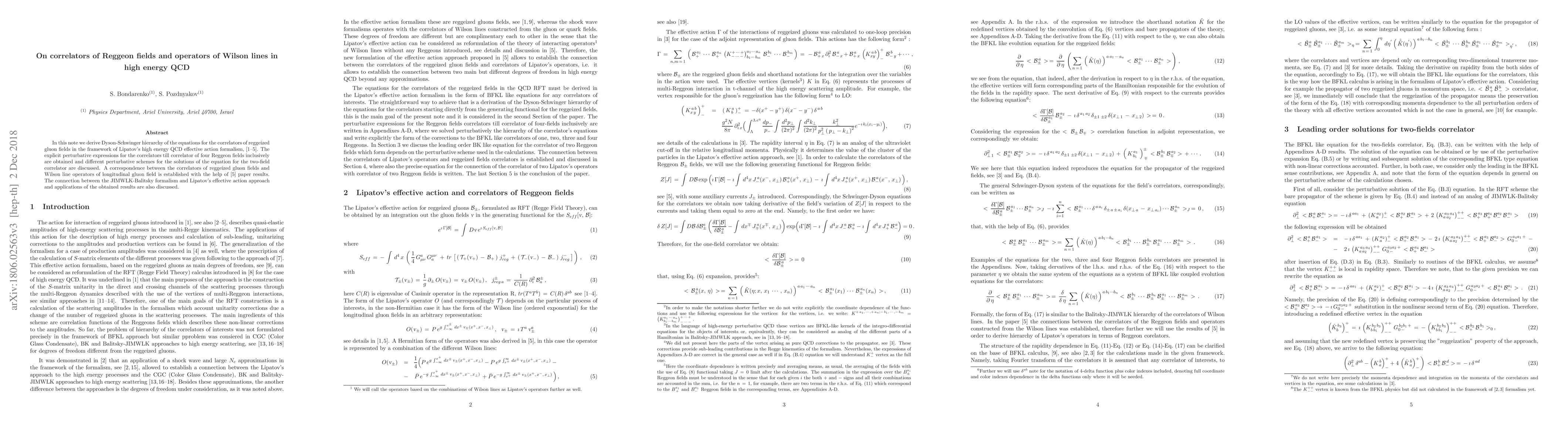 In this note we derive Dyson-Schwinger hierarchy of the equations for the correlators of reggeized gluon fields in the framework of Lipatov's high energy QCD effective action formalism, \cite{LipatovEff,Our1,Our2,Our3,Our4}. The explicit perturbative expressions for the correlators till correlator of four Reggeon fields inclusively are obtained and different perturbative schemes for the solutions of the equation for the two-field correlator are discussed. A correspondence between the correlators of reggeized gluon fields and Wilson line operators of longitudinal gluon field is established with the help of \cite{Our4} paper results. The connection between the JIMWLK-Balitsky formalism and Lipatov's effective action approach and applications of the obtained results are also discussed.
