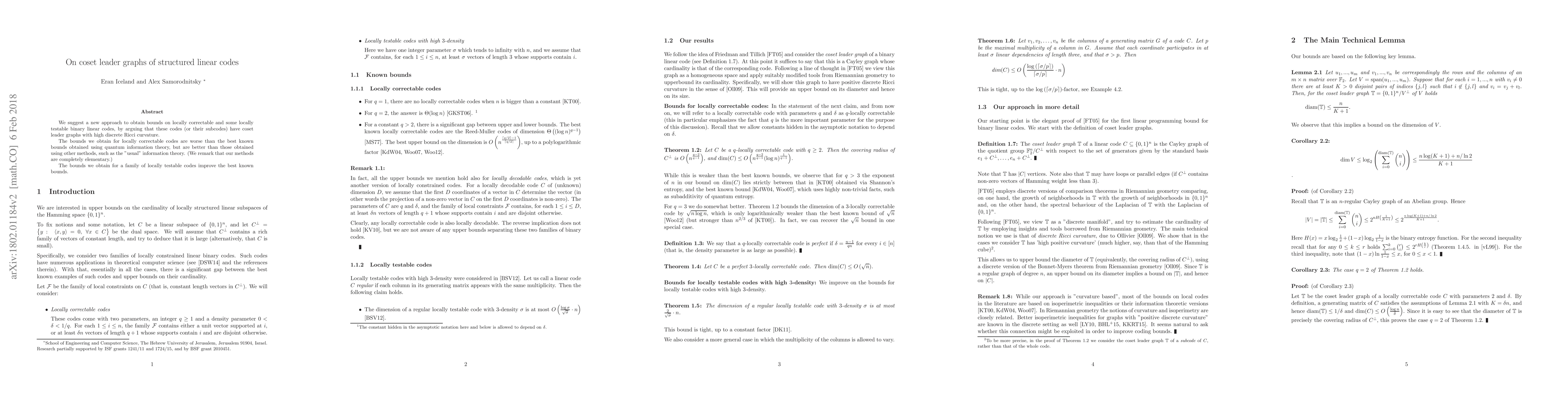 Researchers propose a new method to analyze locally correctable and testable binary linear codes using coset leader graphs with high discrete Ricci curvature, improving existing bounds.